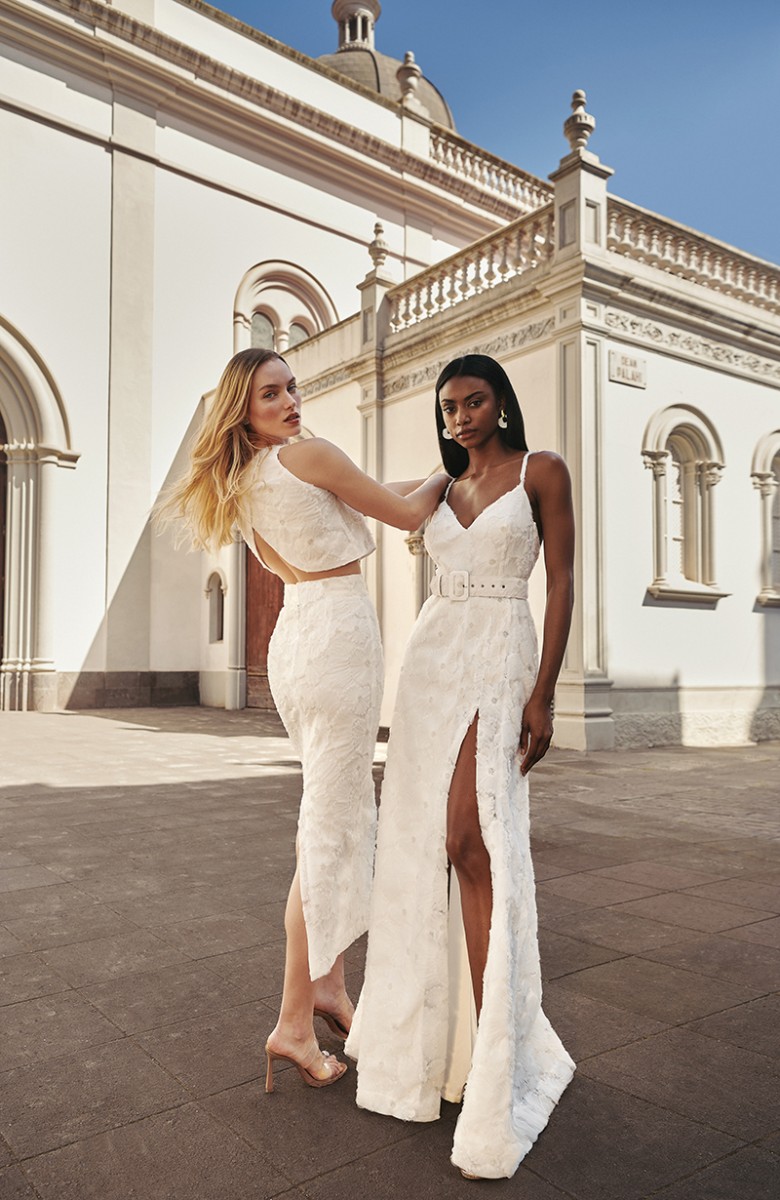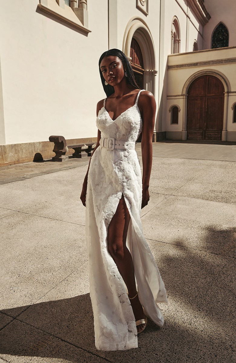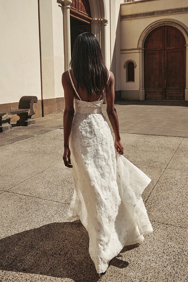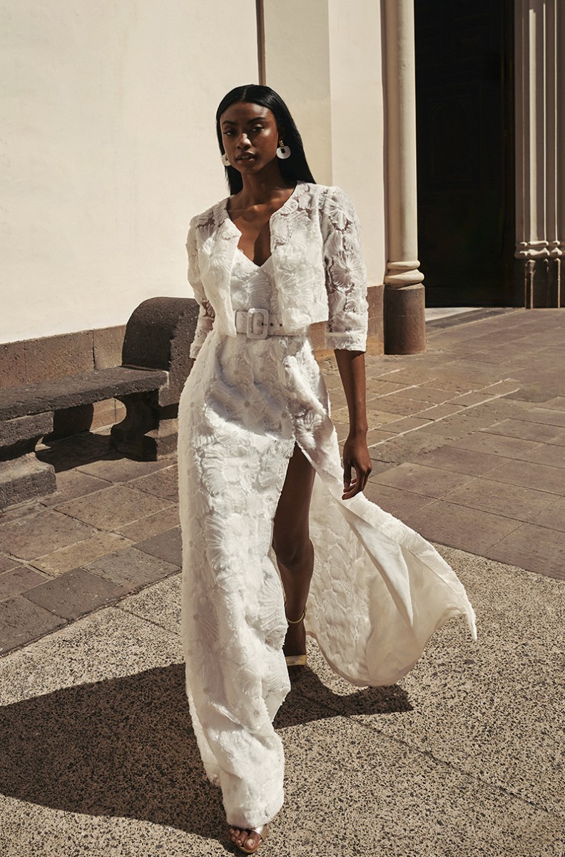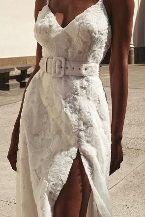 Espectacular vestido largo de corte lencero confeccionado en un tejido de tul blanco con flores en relieve del mismo tejido y pailletes/rocalla en el centro de la flor. (...)