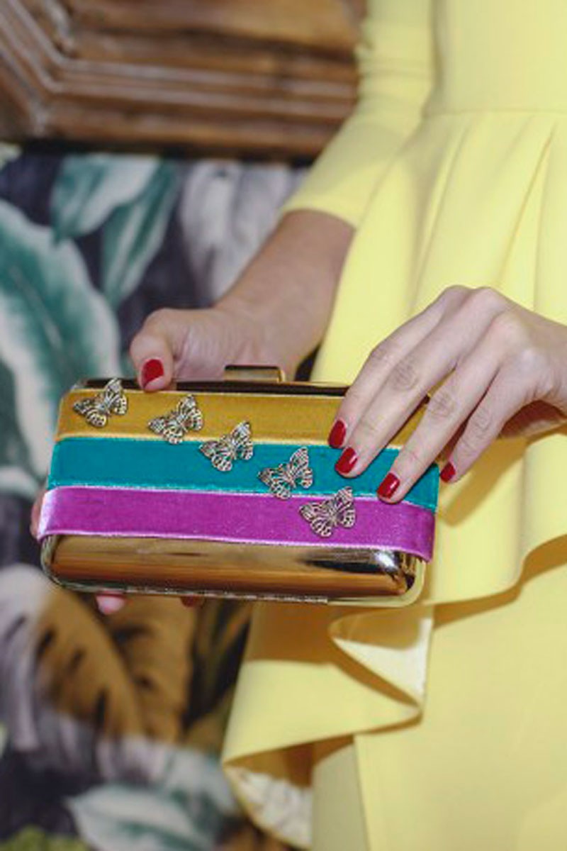Bolso de fiesta con base de latón plateada. Lleva tres tiras de terciopelo mostaza,azul y frambuesa en horizontal y mariposas plateadas. (...)