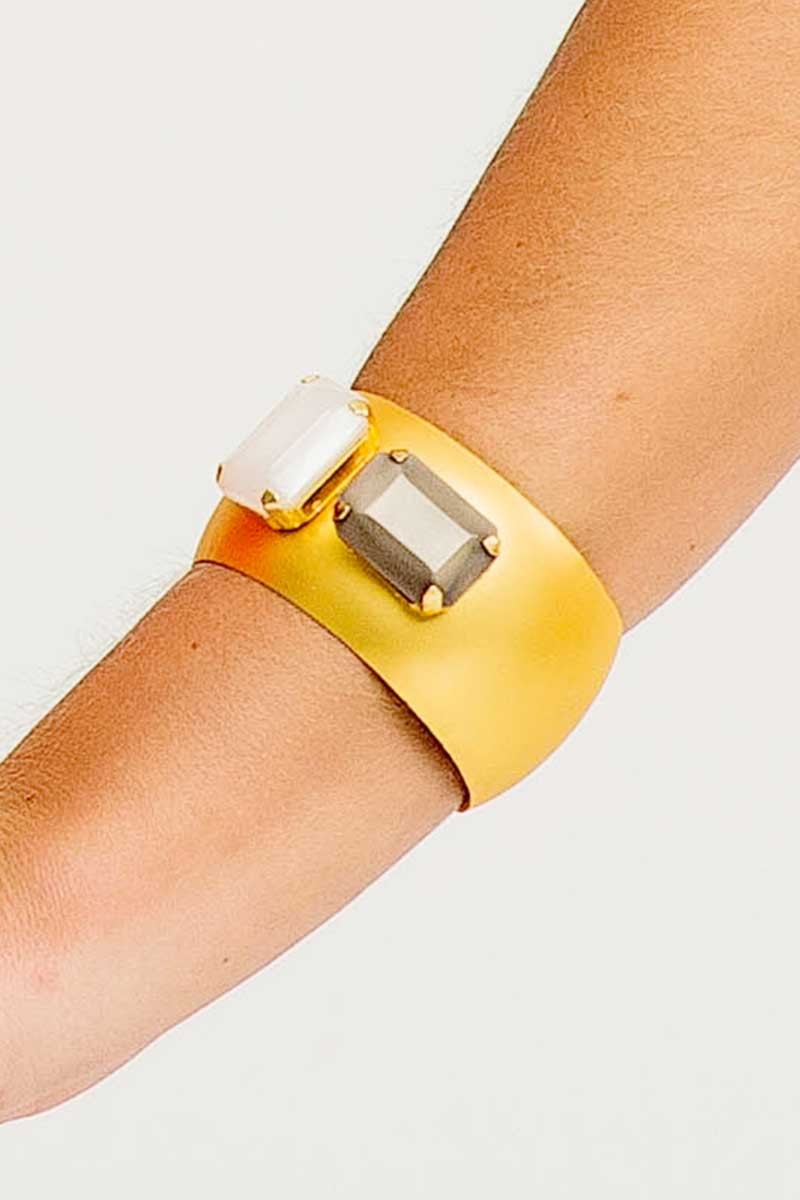 Precioso brazalete dorado de base redondeada con dos piedras facetadas en tono blanco y gris, engarzadas en base dorada. (...)