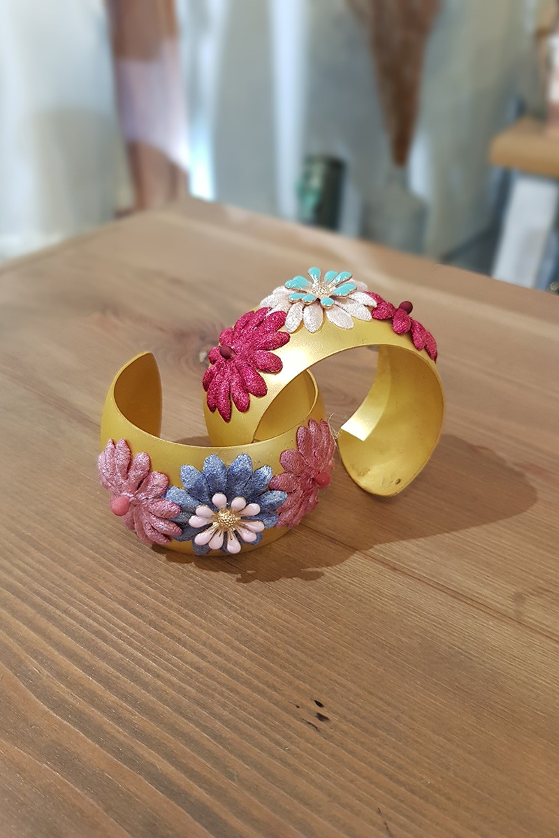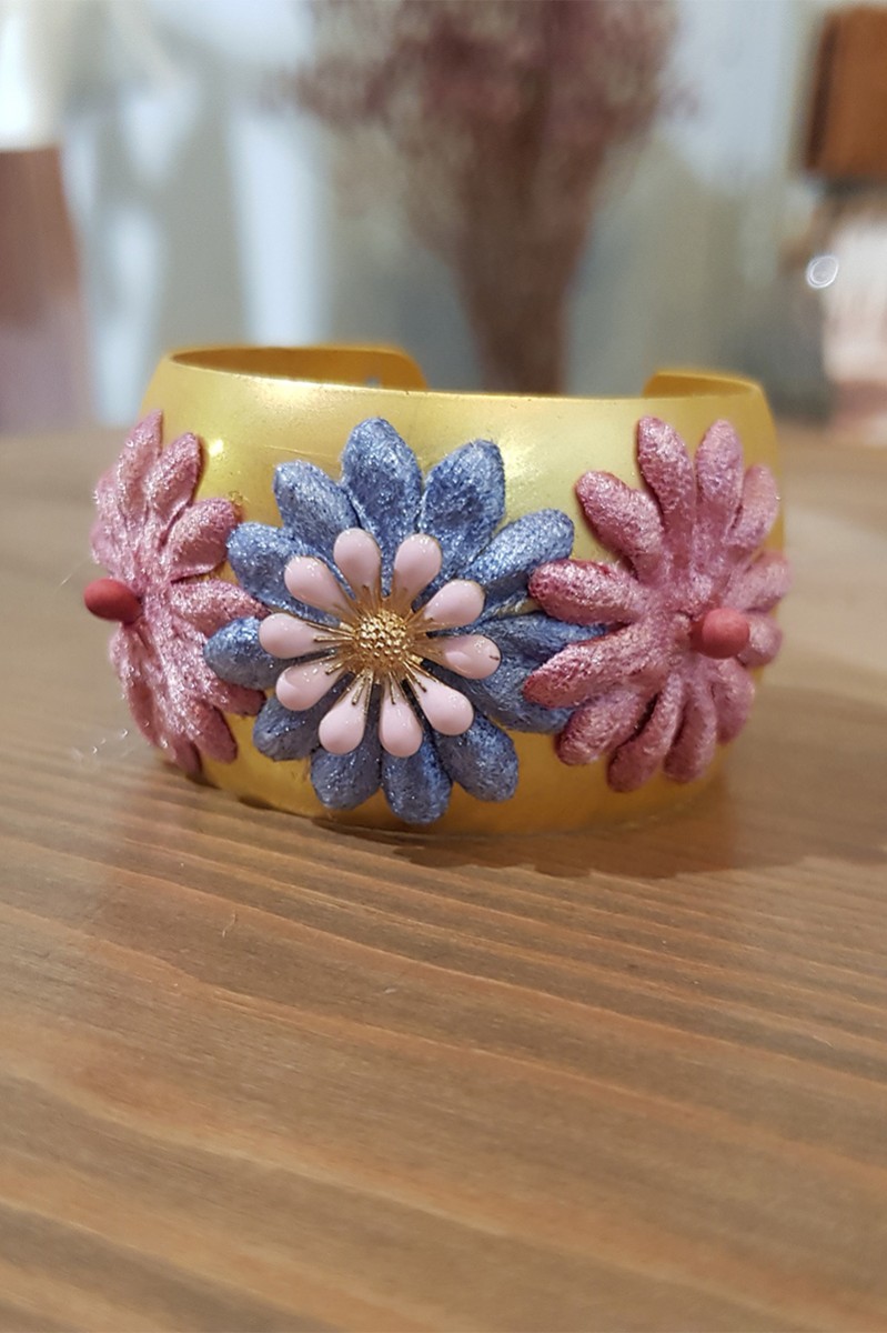 Precioso brazalete dorado de base redondeada con flores de terciopelo azules y rosas y flor metálizada rosa. (...)
