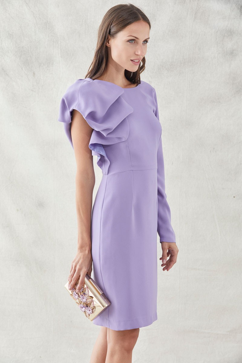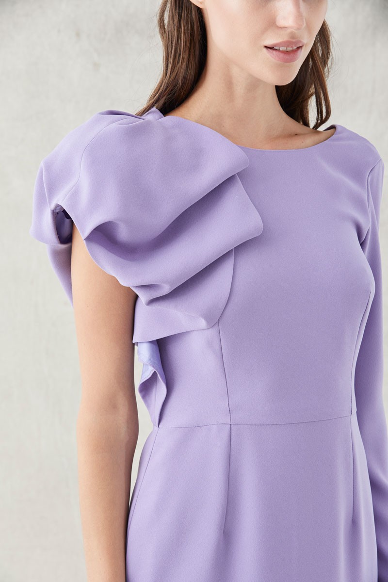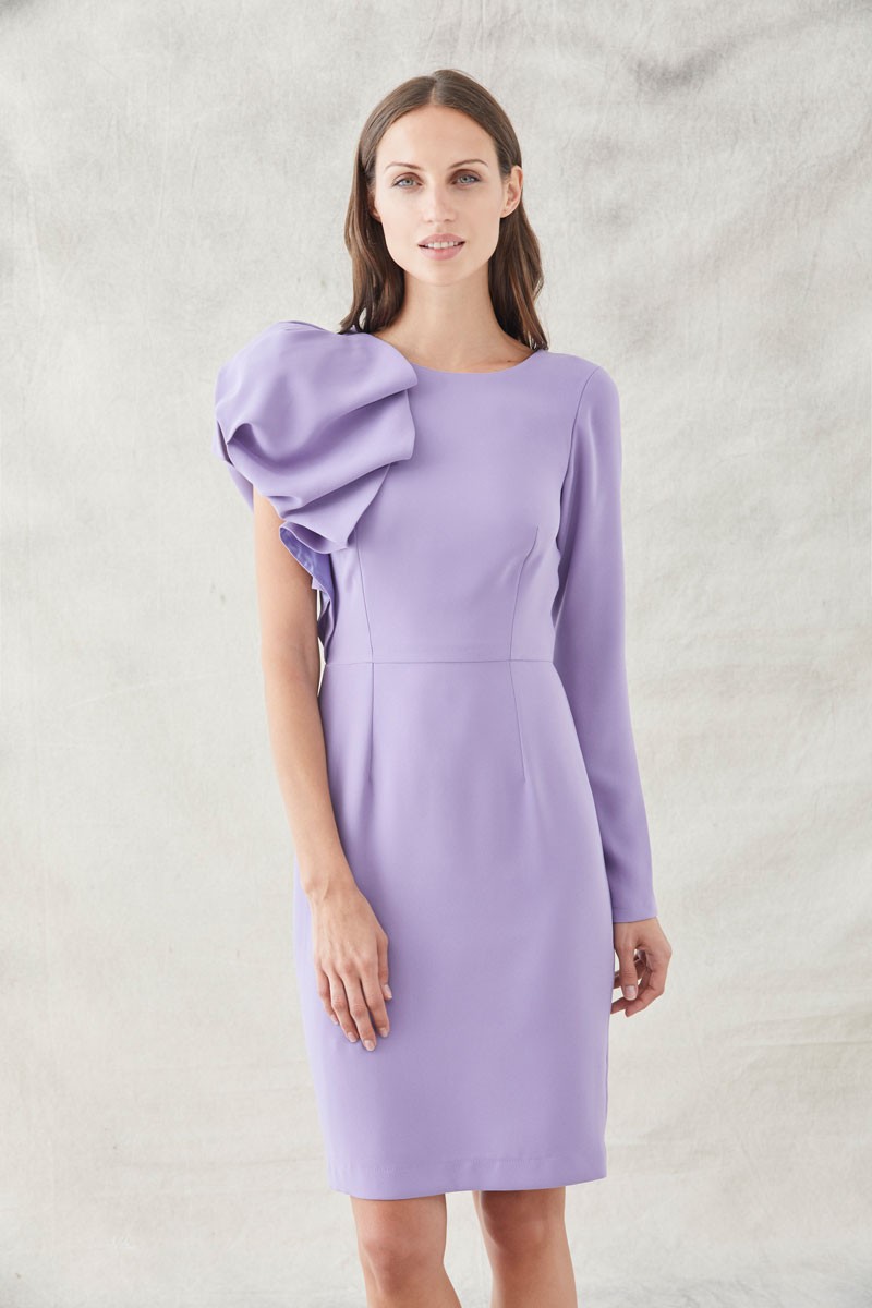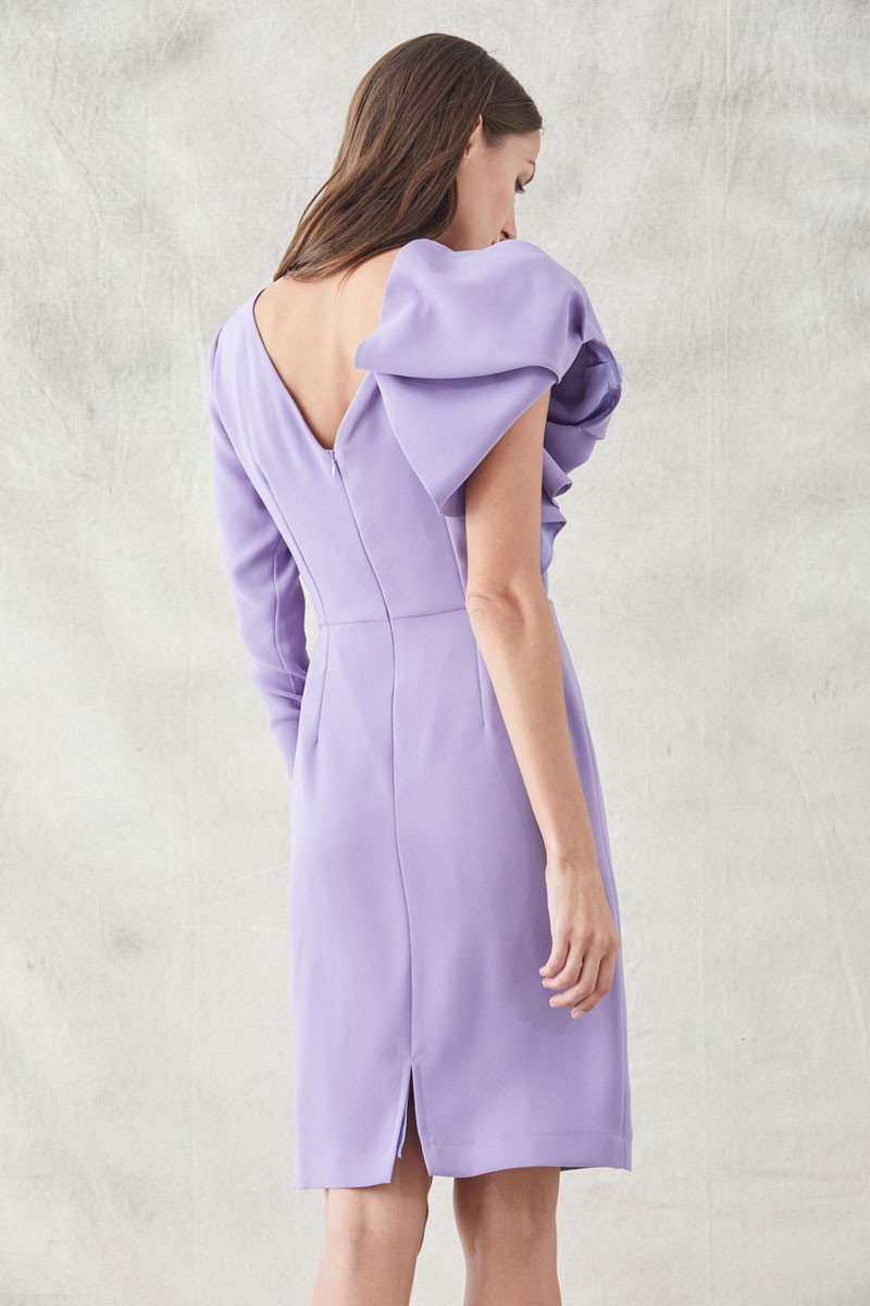 Precioso vestido corto de mangas asimétricas confeccionado en tejido de crepe malva. Diseño versátil con mangas asimétricas , una larga y la otra abullonada y escote (...)