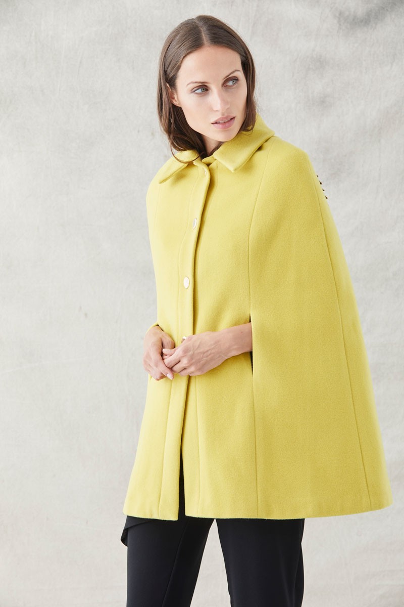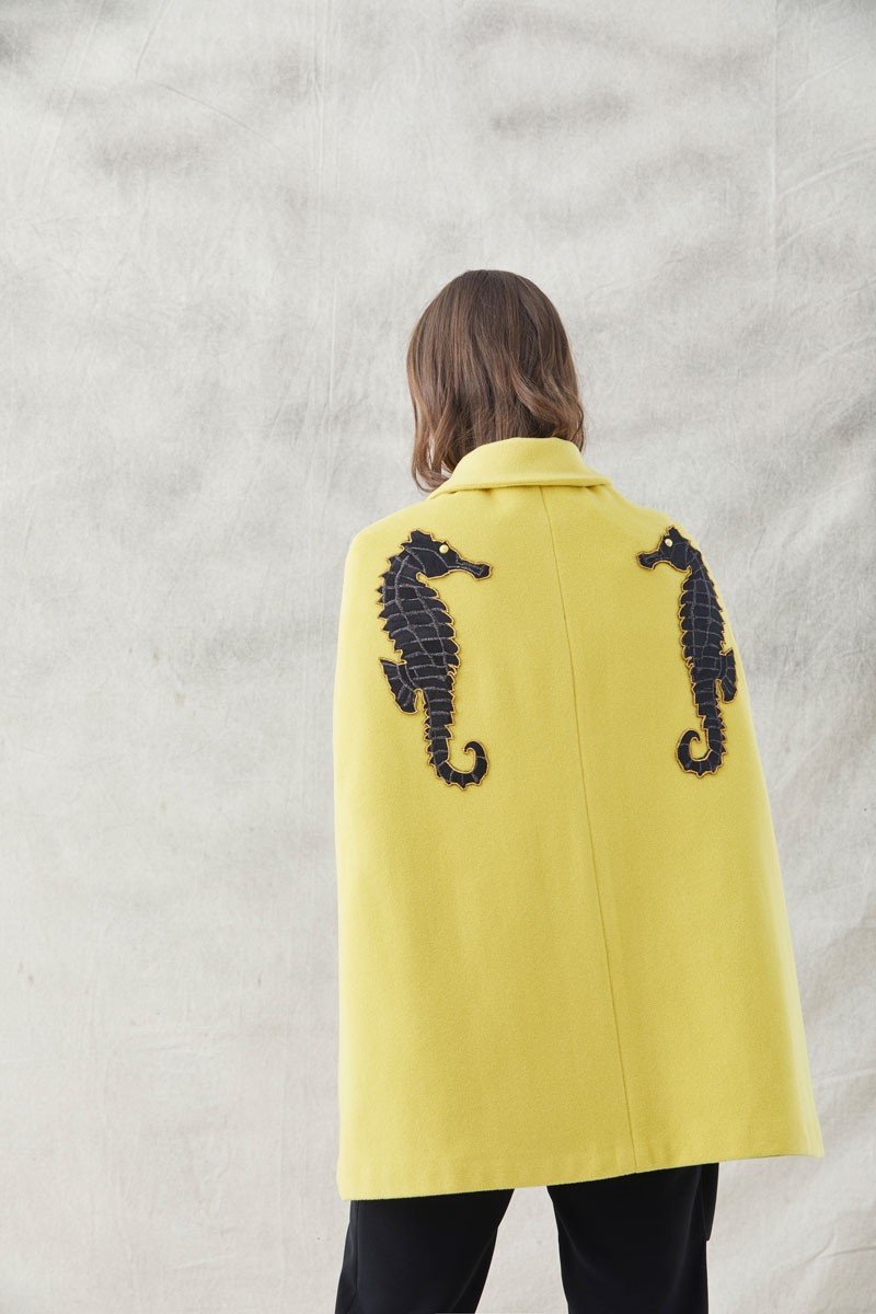 Capa confeccionada en tejido de paño de excelente calidad en color mostaza. Precioso detalle de dos caballitos de mar bordados con hilos de lúrex y una perla en la espalda. Forro (...)