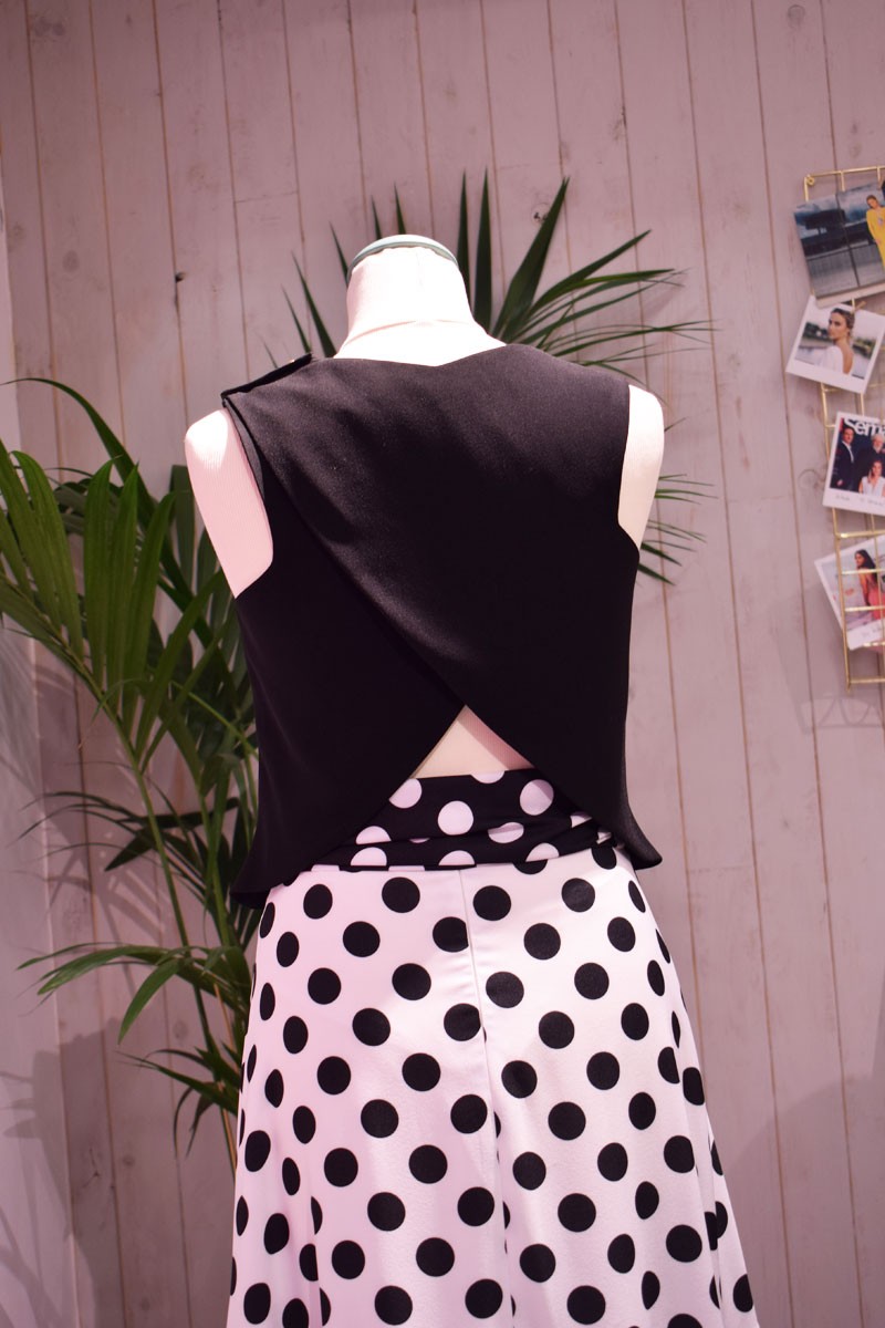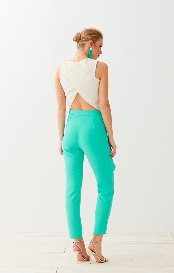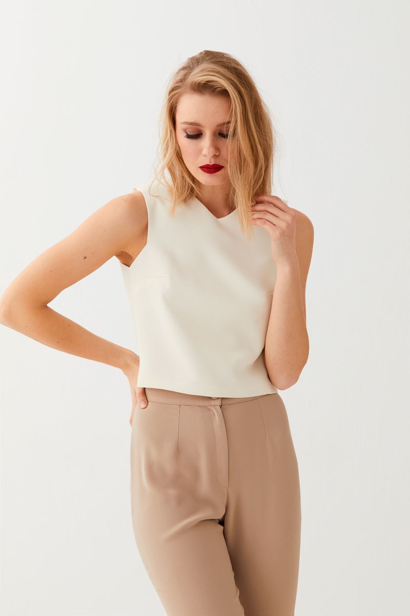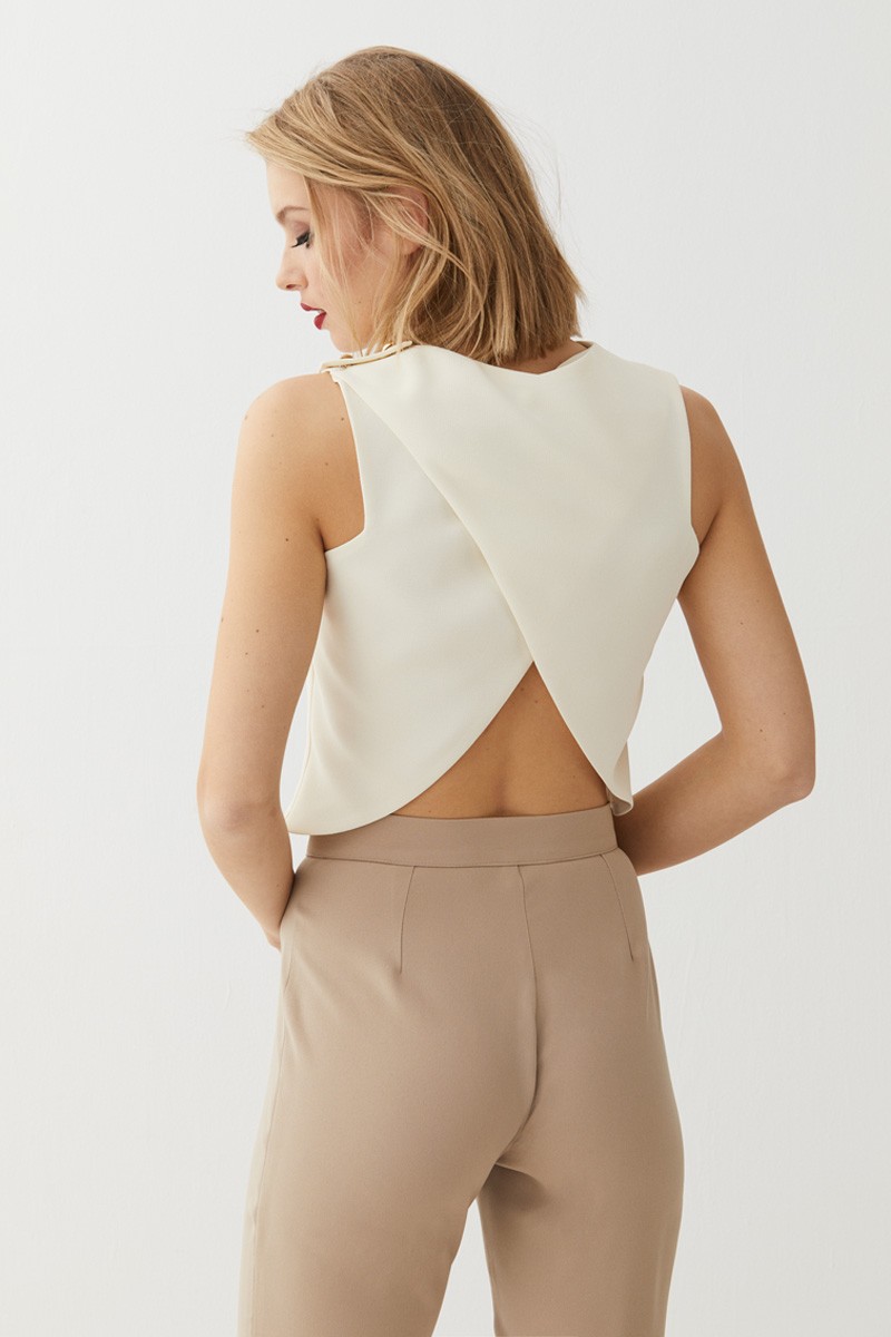 Top cruzado en espalda confeccionado en tejido de crepe color blanco crudo. Diseño origginal cerrado por delante y con un bonito escote en la parte baja de la espalda en la que se (...)