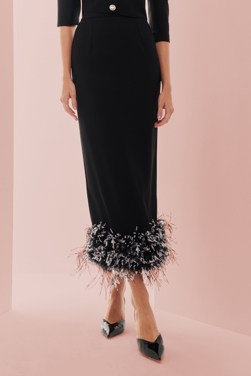 Espetacular falda confeccionada en crepe negro de gran calidad. Corte recto con pequeña abertura en la parte de atrás, destacada por sus dos boas de plumas de marabú y (...)