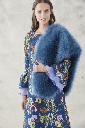 Los pendientes de lágrimas plateados y la estola de pelo azul,a juego con el estampado floral, son los accesorios perfectos para completar el look con mucha luz. ¡Te verás espectacular!