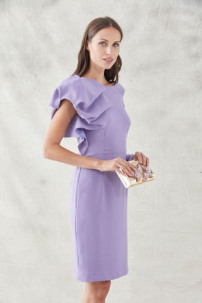 Precioso vestido corto de crepe en color lila. Diseño versátil con una manga abullonada y la otra larga. La diadema y el clutch, ambos de flores lilas y hojas doradas, ofrecen a este look un toque diferente y original.