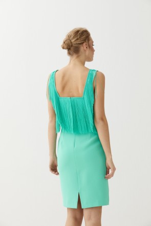 Vestido corto recto confeccionado en crepe de color aguamarina con flecos perfecto para acudir a una comunión.