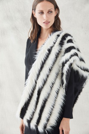 El top Carlota en negro con hombro abullonado combina a la perfección con la falda Minnie, confeccionada en tejido de pata de gallo en tonos grises y blancos, con lazos de terciopelo y corte midi lo que crea una silueta de lo más elegante.La estola de pelo blanco y negro y los pendientes de piedras facetadas en grises y negros son los accesorios perfectos para este look de evento invernal.