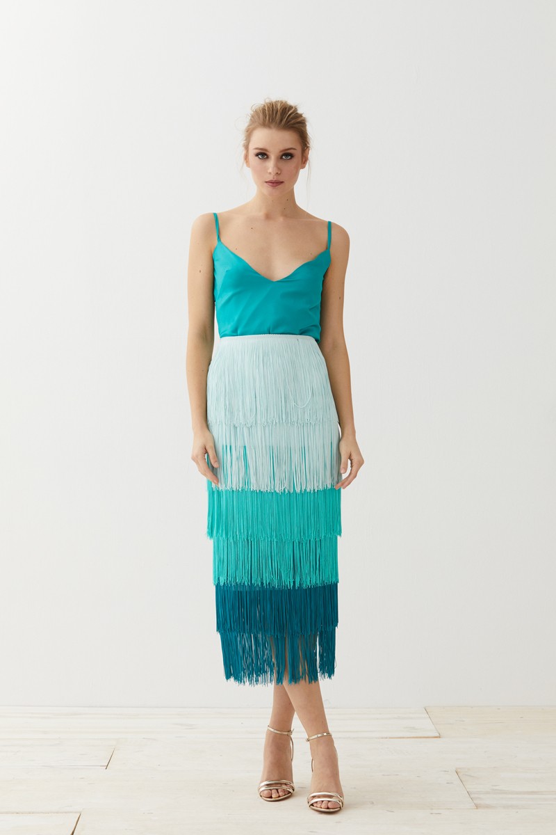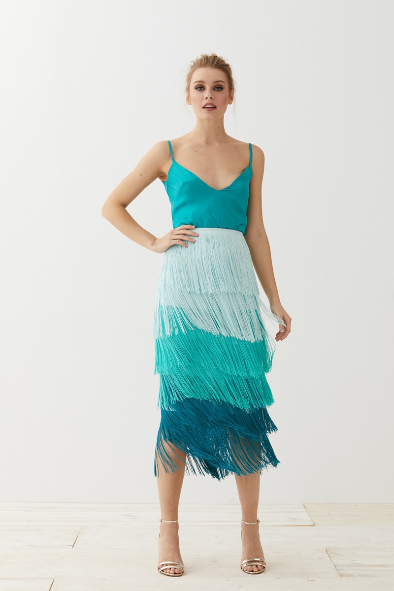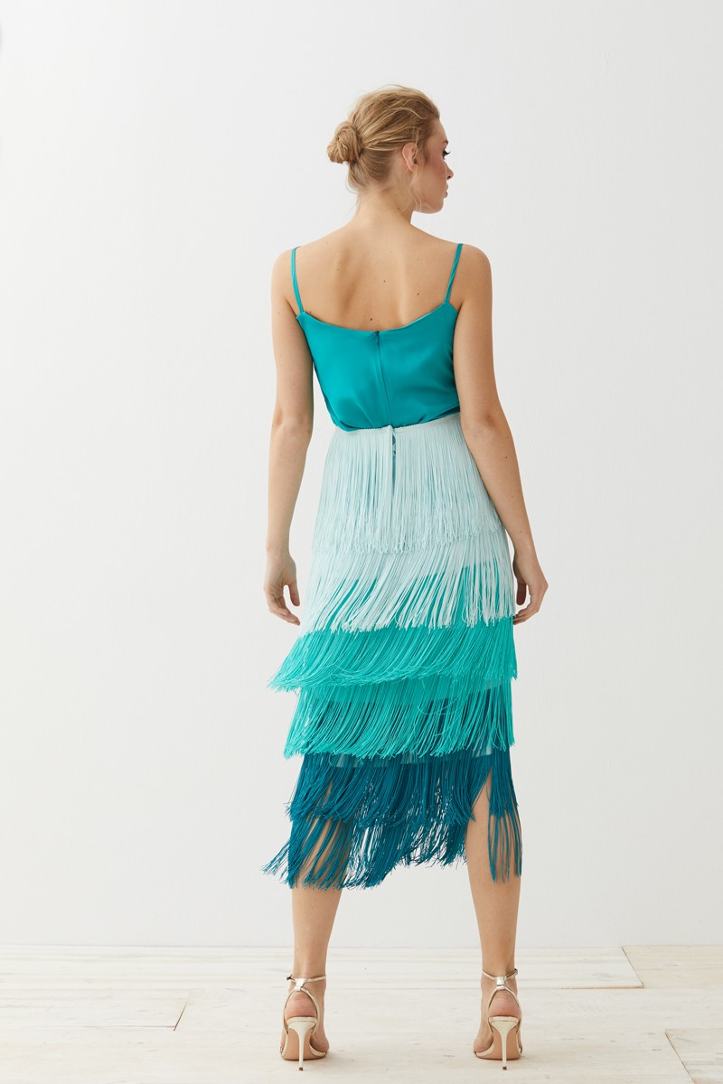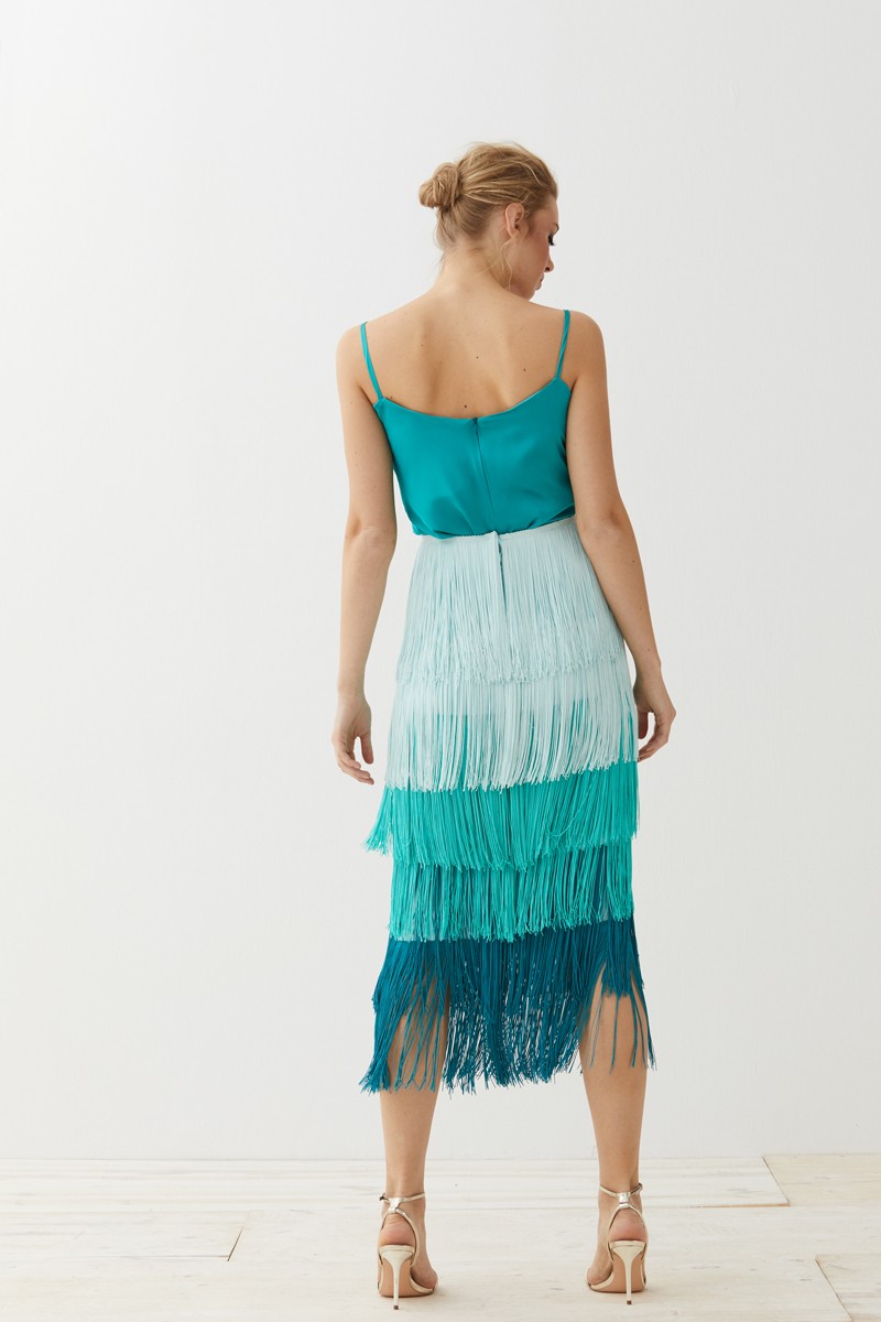 Preciosa Falda de Flecos en color tonos aguamarinas de corte midi. Una maravillosa falda entubada cuya base está confeccionada en crepe de color aguamarina y en la que destacan los (...)