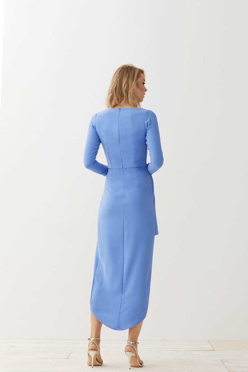 Precioso vestido midi confeccionado en crepe azul de excelente calidad, con manga larga y peplum en la cintura. Escote en pico cruzado, falda cruzada asimétrica. (...)