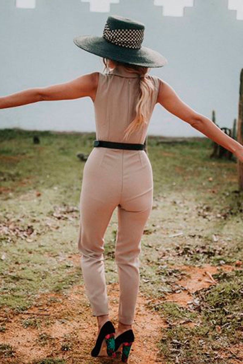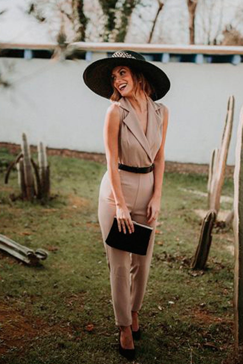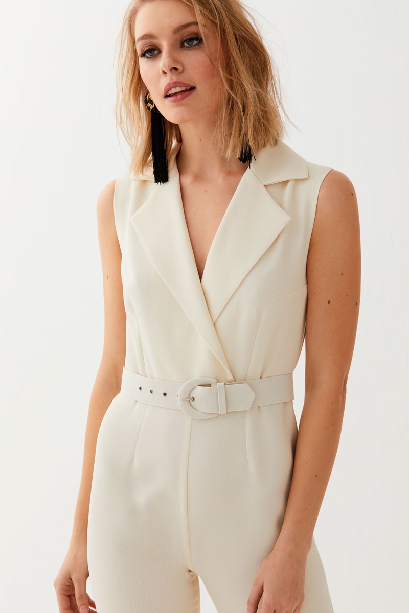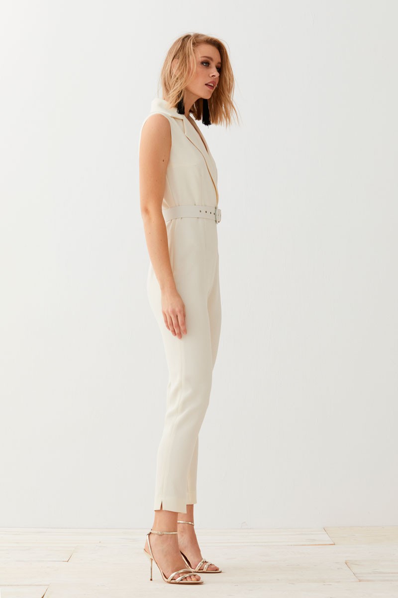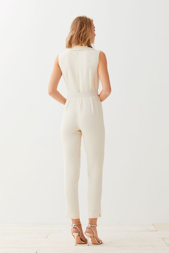Espectacular mono de fiesta tipo esmoquin confeccionado en crepe blanco con solapas y sin mangas. Pernera estrecha con largo por el tobillo. Forro interior y cremallera posterior invisible. (...)