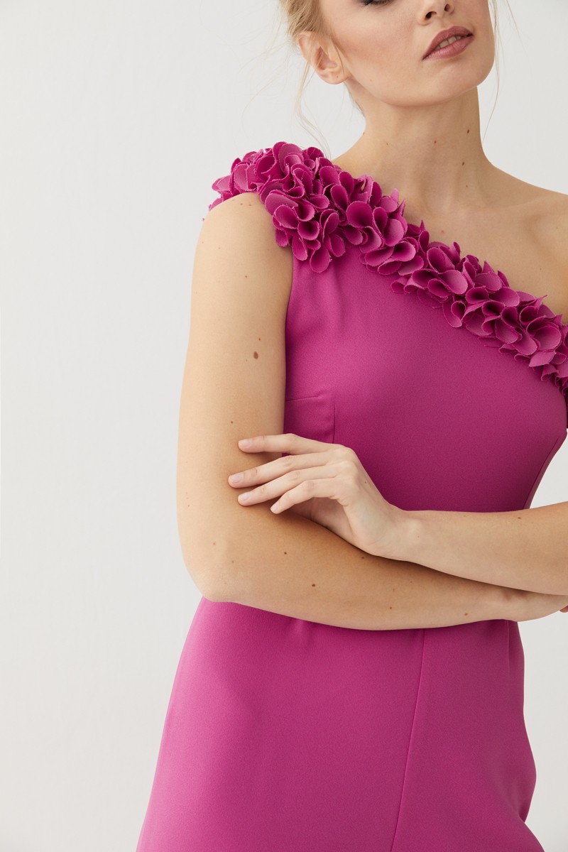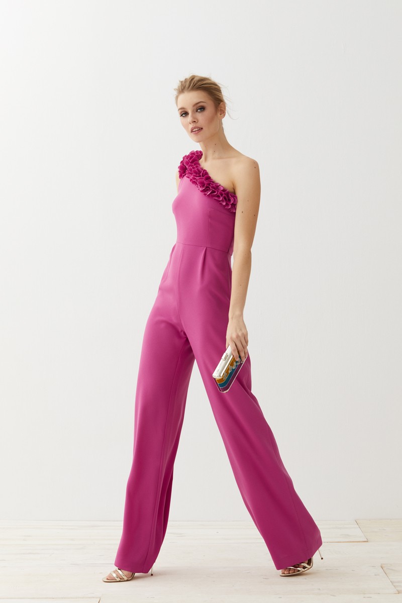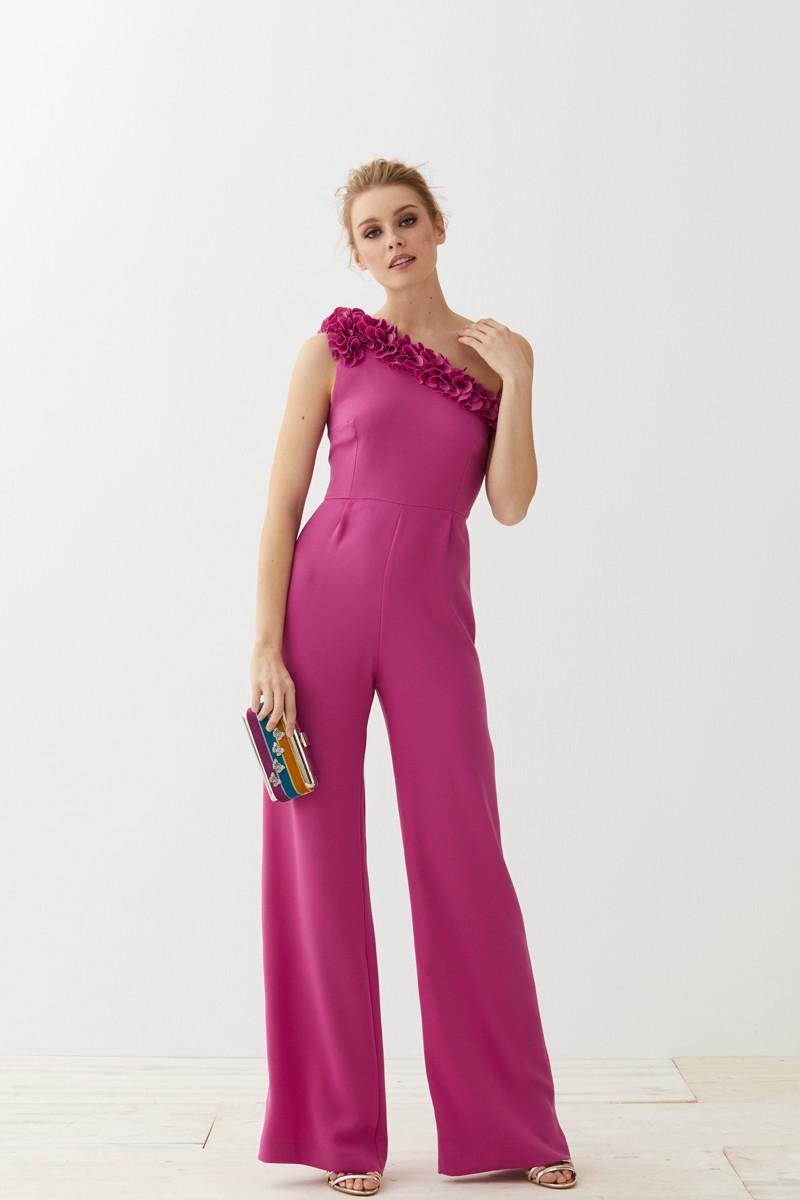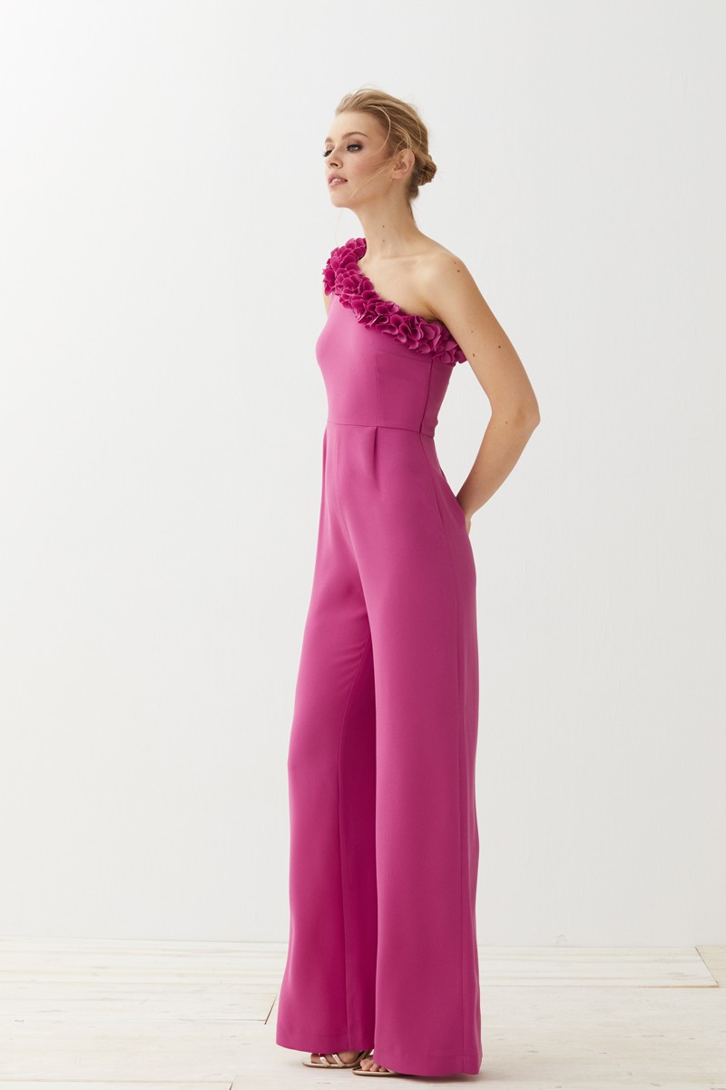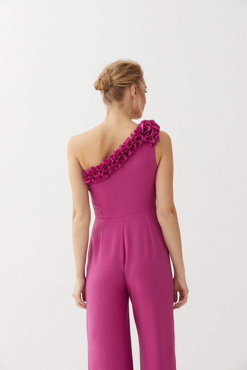 Espectacular mono de fiesta asimétrico confeccionado en crepe color frambuesa con adorno de flores en el propio tejido adornando todo el escote. Pernera ancha. Forro interior y cremallera (...)