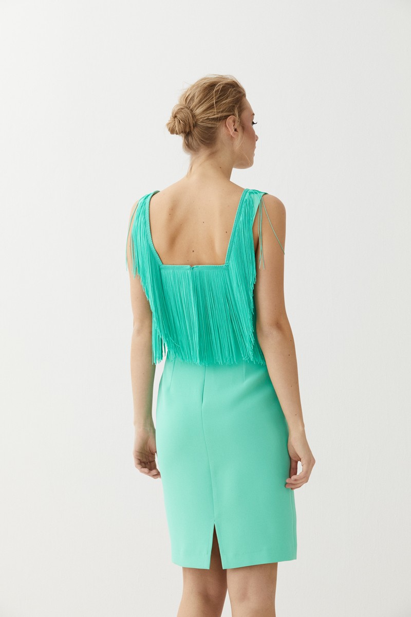 Vestido corto recto confeccionado en crepe de color aguamarina con flecos. (...)