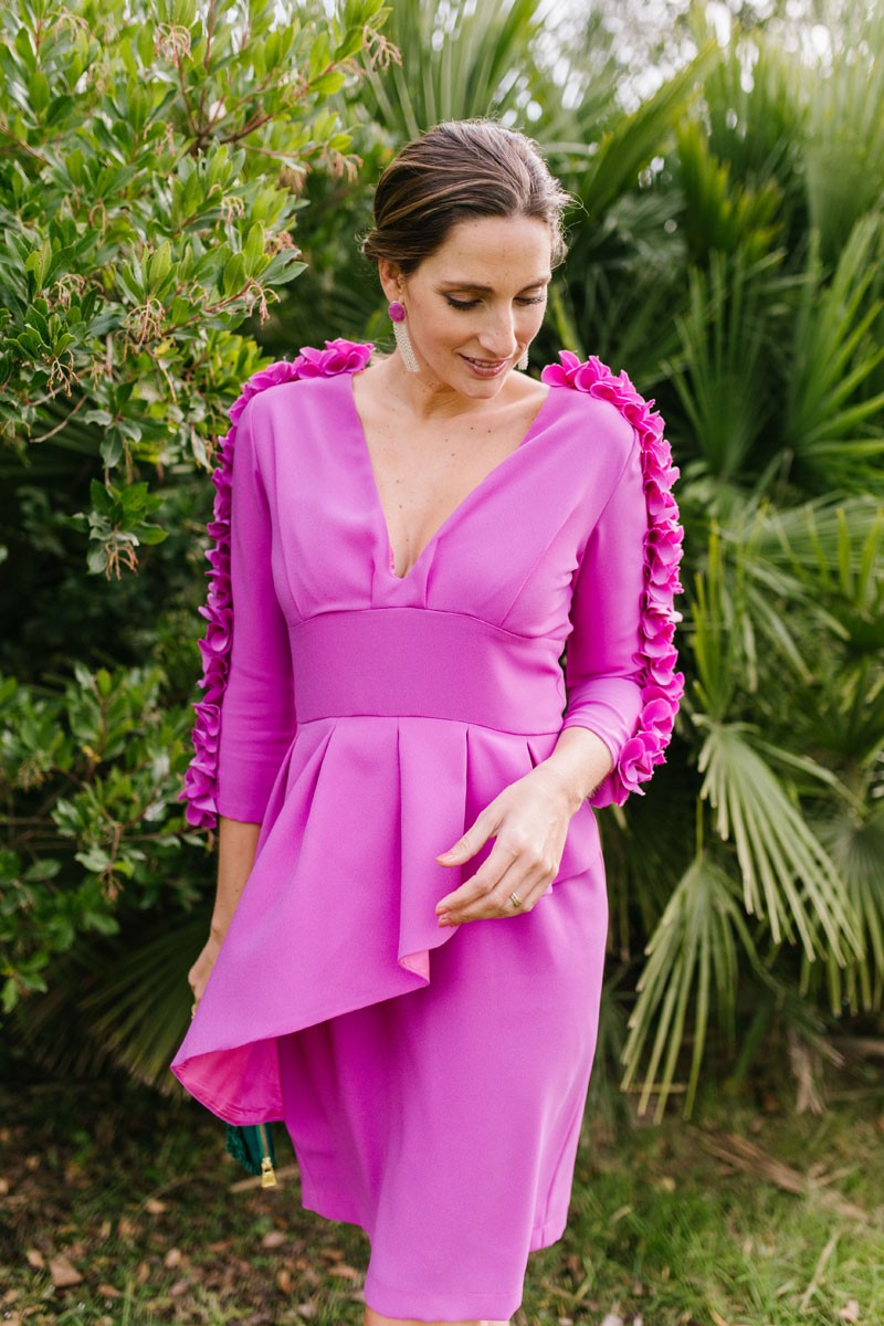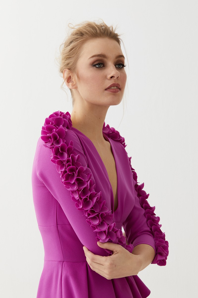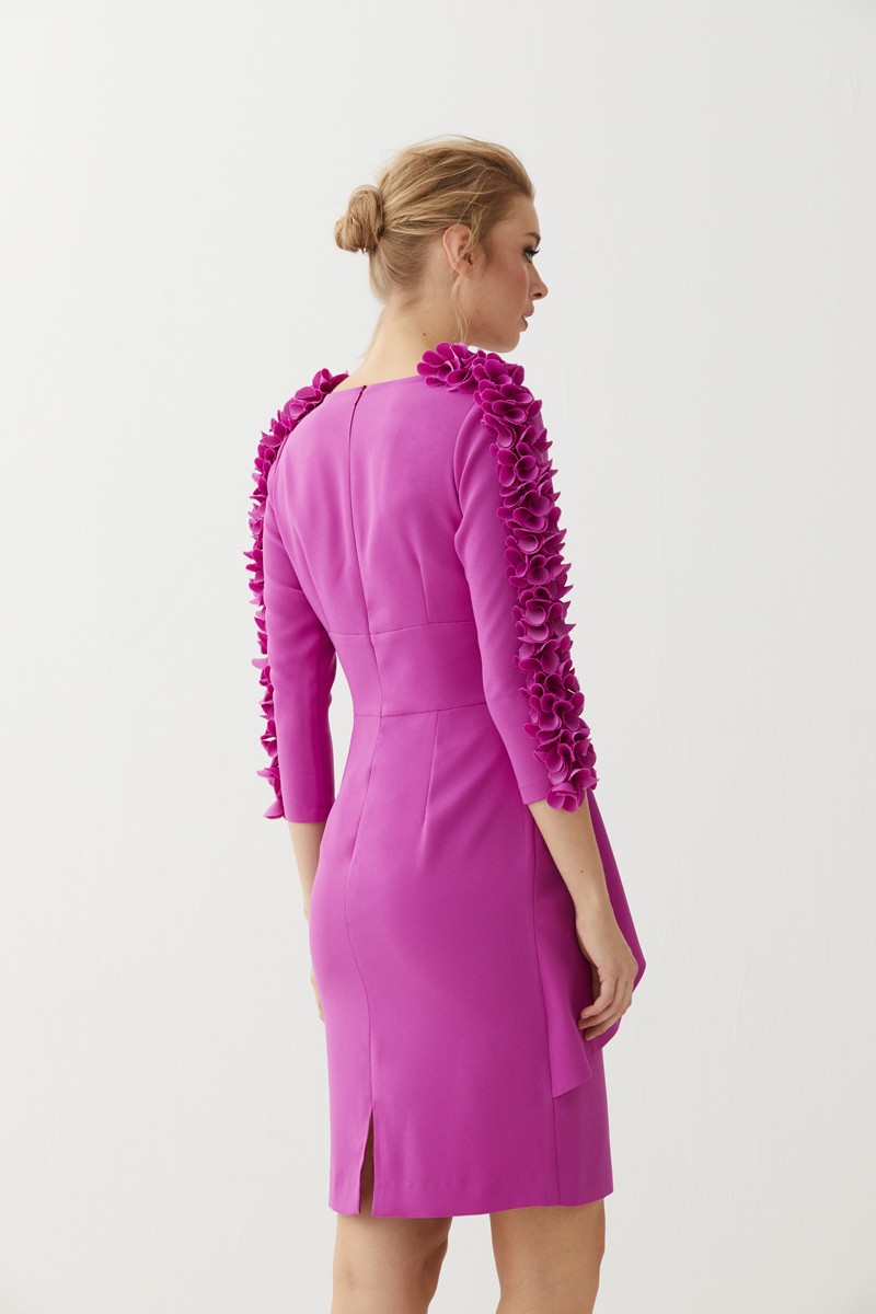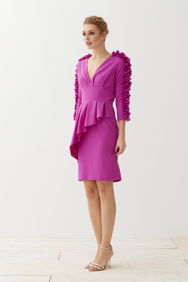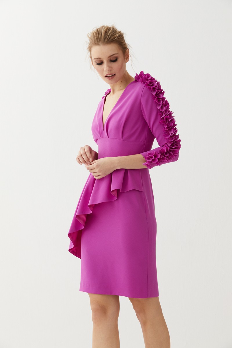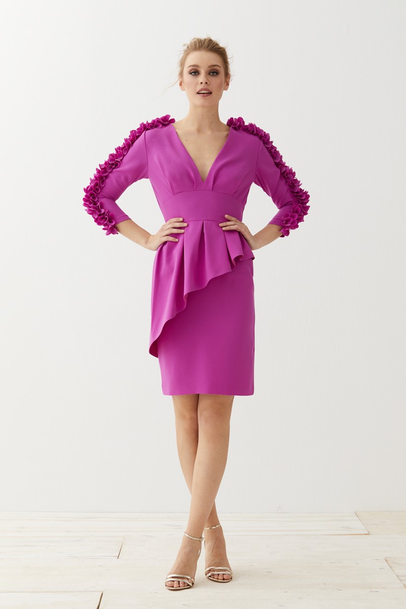 Vestido corto recto confeccionado en crepe de color rosa frambuesa con peplum. (...)