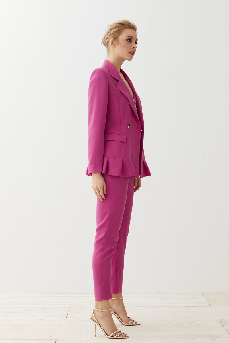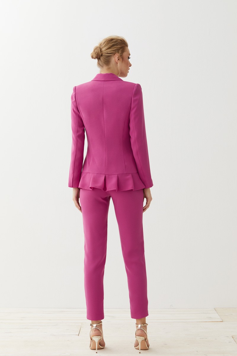 Traje formado por dos piezas, chaqueta y pantalón, confeccionado en un precioso crepe de color rosa fucsia. (...)