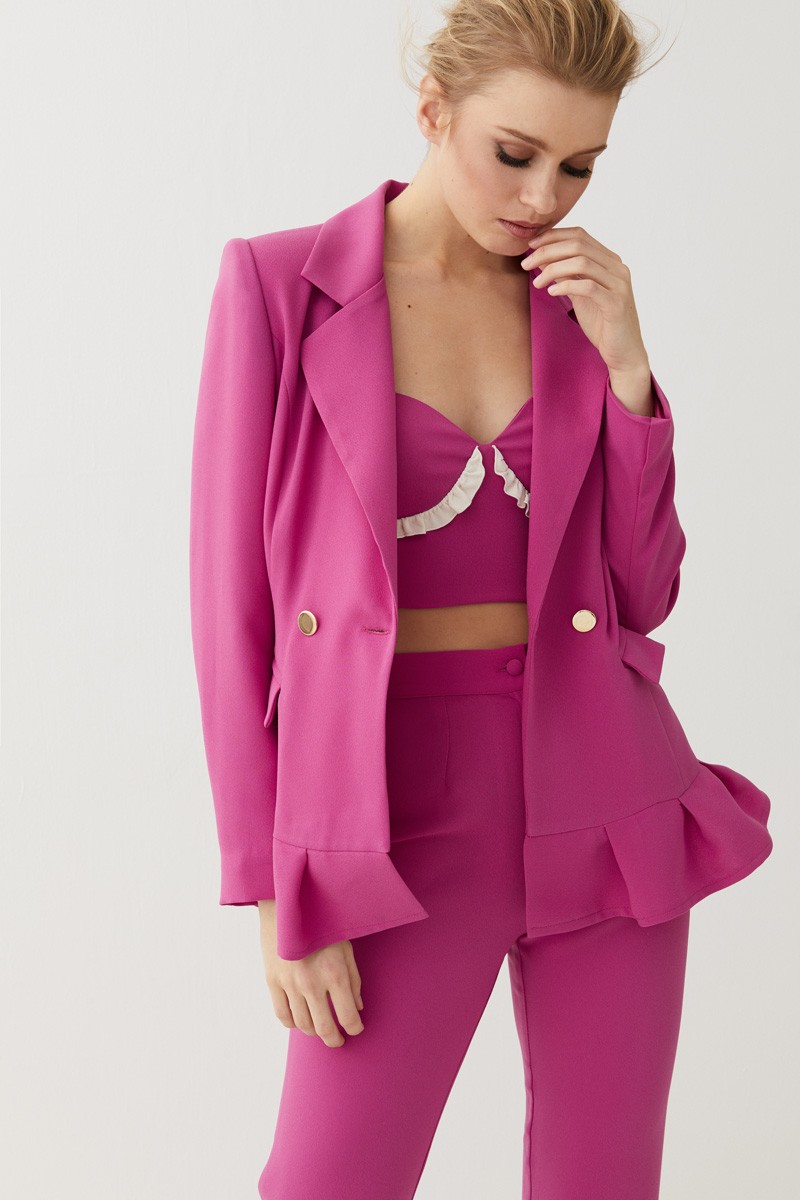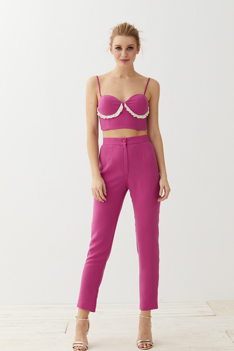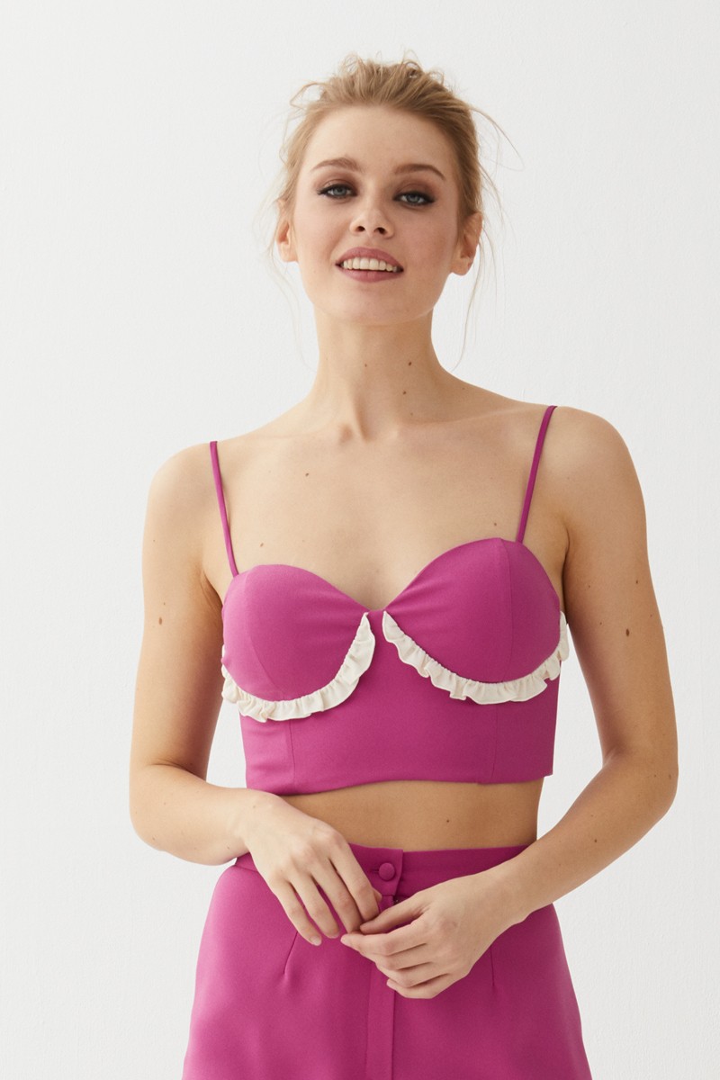Precioso top corto confeccionado en tejido de crepe color rosa. Diseño original a modo de corpiño con tirantes finos y con cazuelas que realzan el pecho. Adornado por un (...)