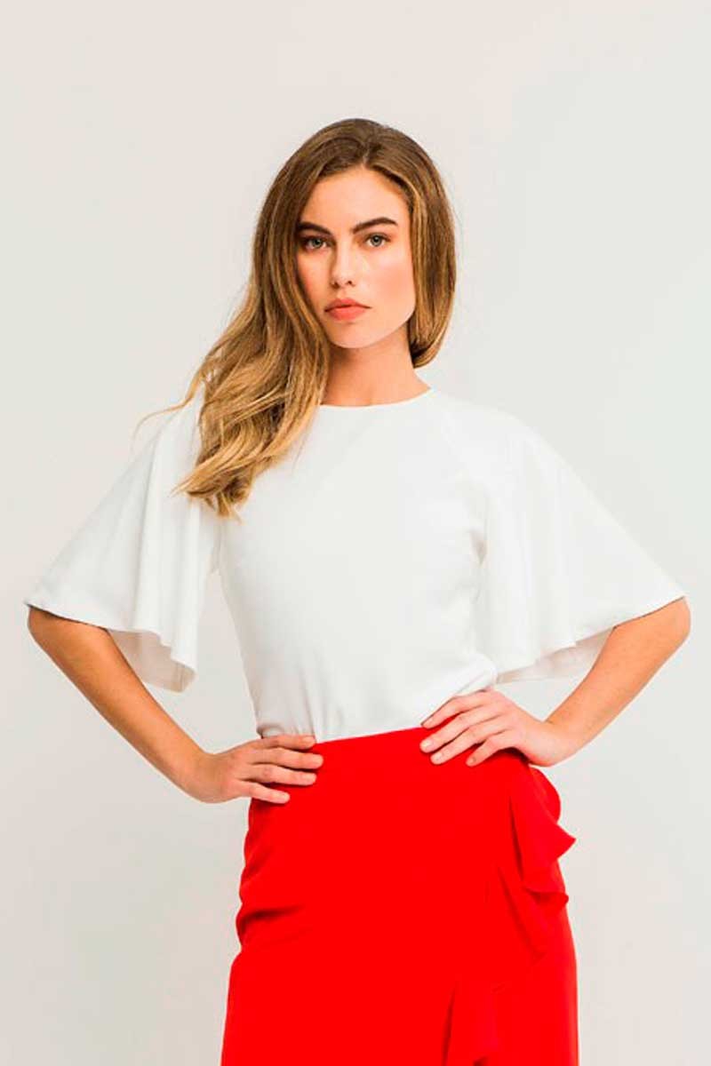 Preciosa blusa confeccionada en crepe de color blanco, azul o rojo de manga ranglan acampanada hasta la altura del codo y escote cerrado redondo. (...)