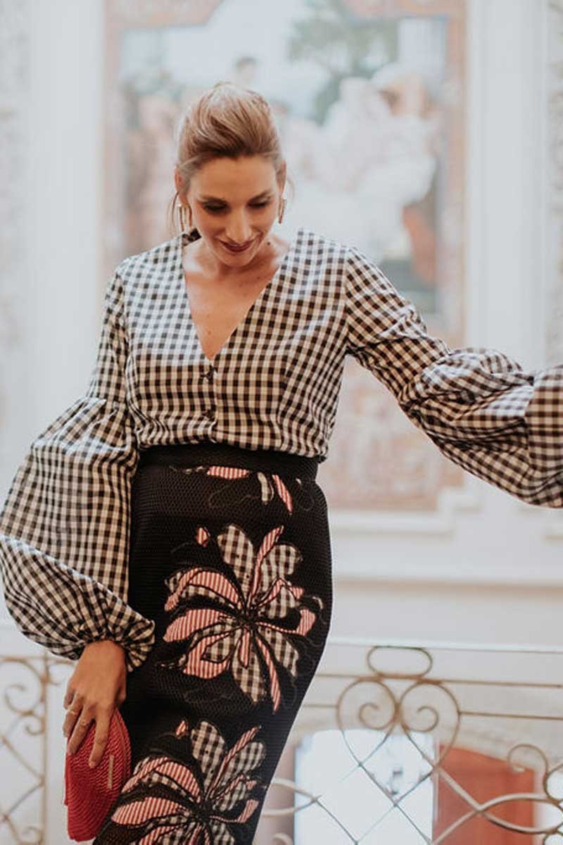 Falda de red gruesa de corte recto y largo por debajo de la rodilla, con grandes flores bordadas en relieve con cuadro vichy en su interior. (...)