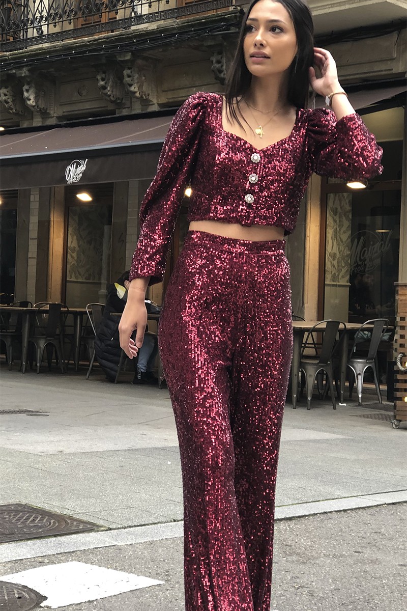 Precioso conjunto joya de 2 piezas confeccionado en lentejuela color granate. (...)