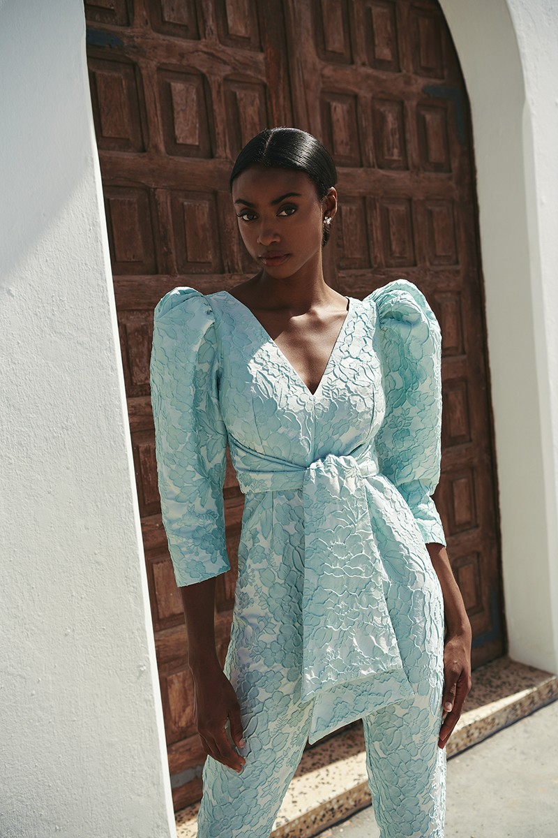 Precioso mono brocado con escote en pico y mangas abullonadas, confeccionado en un tejido jacquard de gran calidad en color rosa palo con dibujo en relieve de flores. Lleva lazada para atar en la (...)