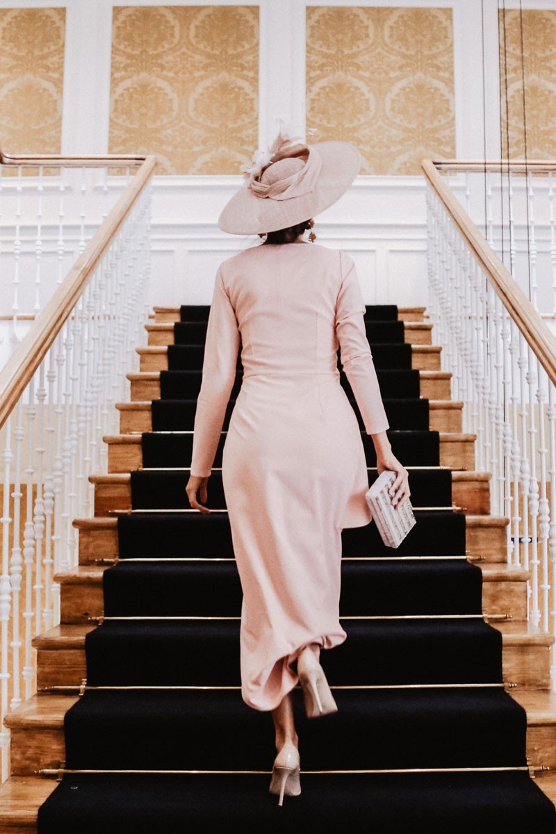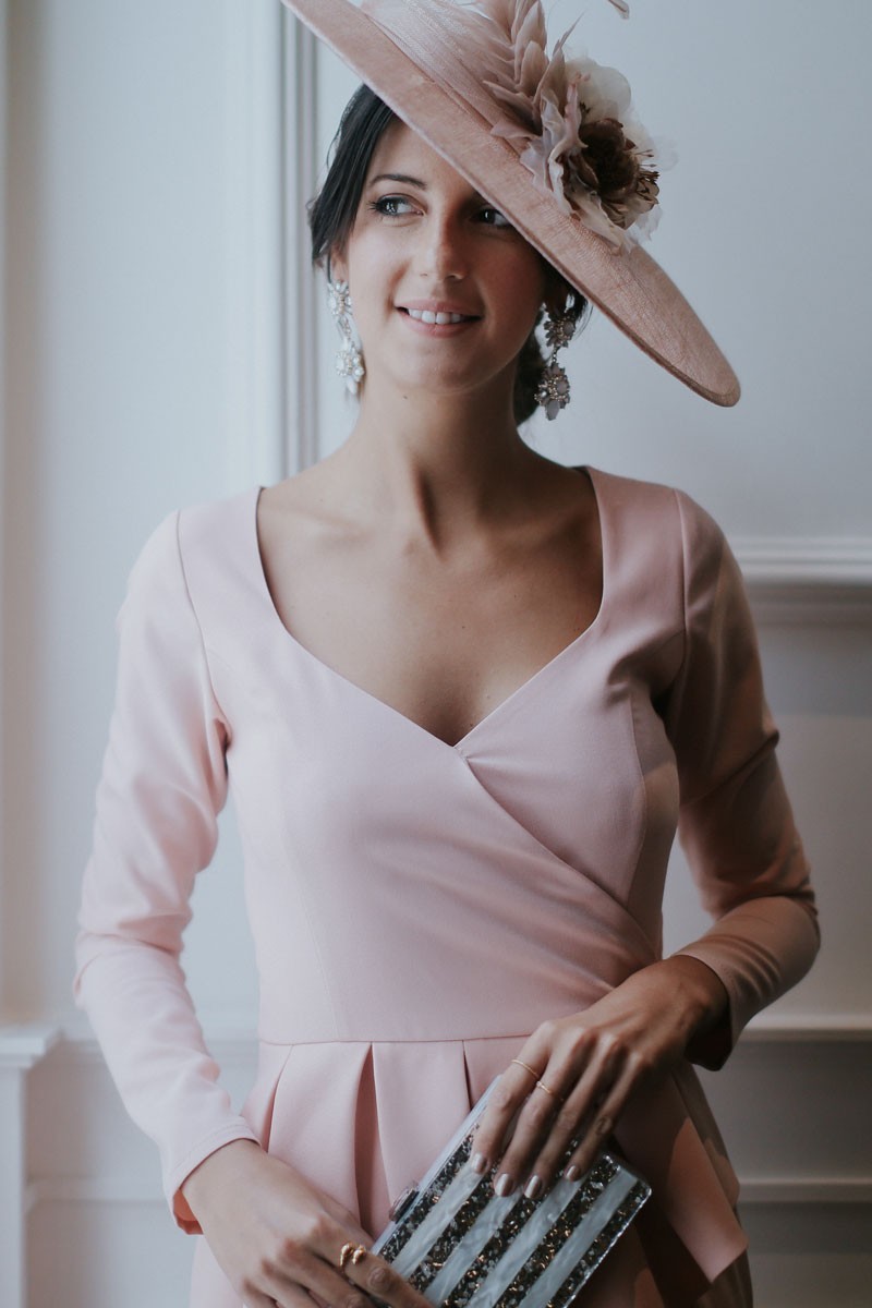 Precioso vestido midi confeccionado en crepe de color rosa palo de excelente calidad, con manga larga y peplum en la cintura. Escote en pico cruzado, falda cruzada asimétrica. (...)