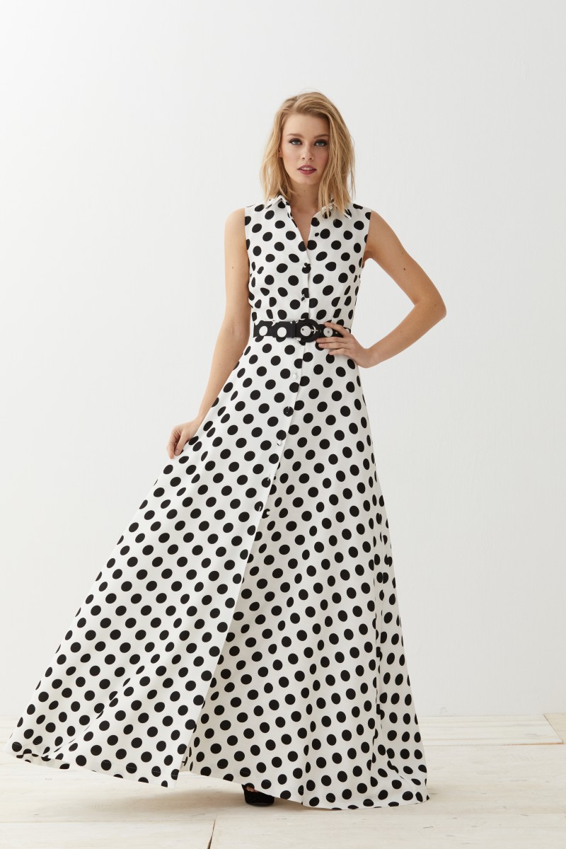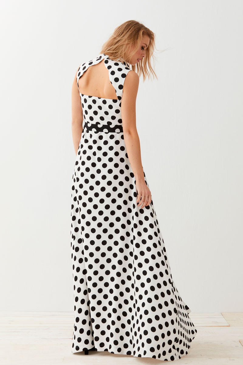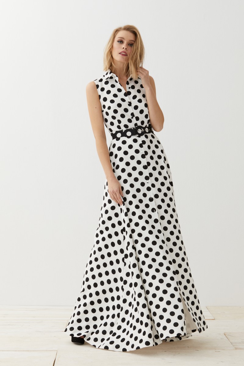 Vestido largo camisero confeccionado en crepe satén blanco con lunares negros de excelente calidad, sin mangas y ajustado en la cintura. Tiene un precioso escote en (...)