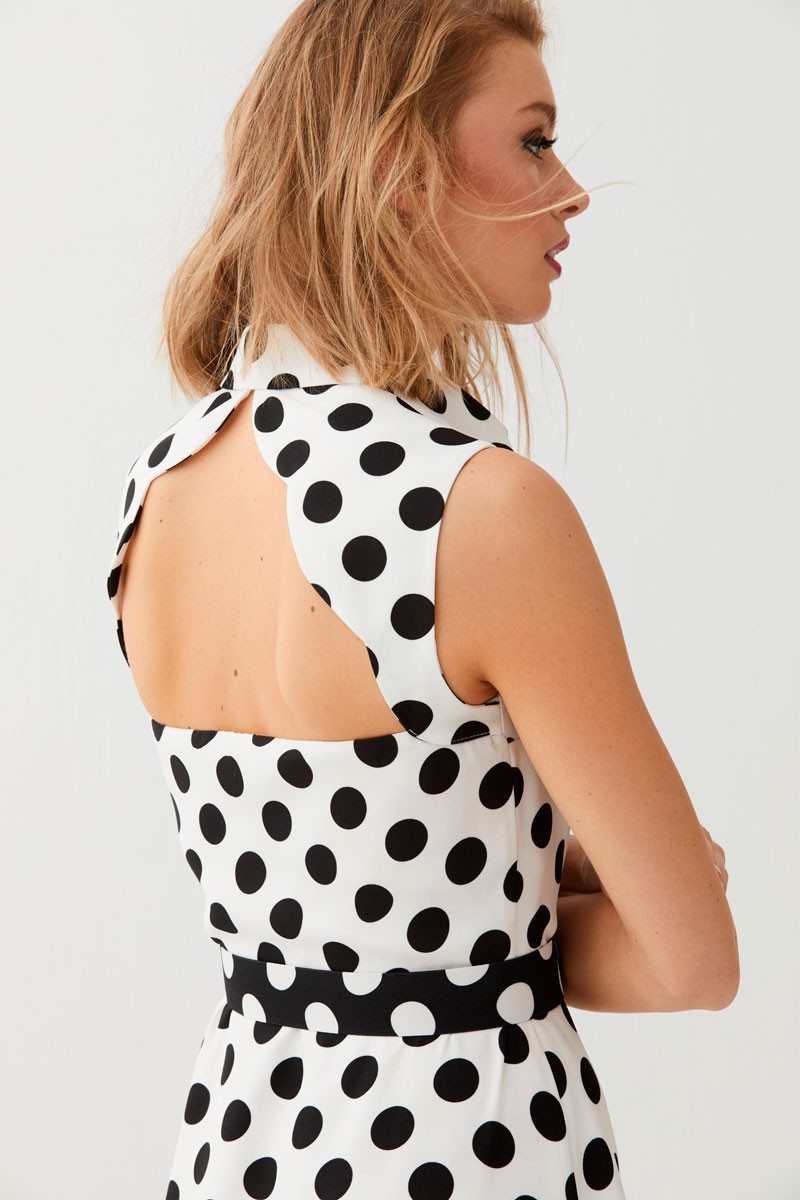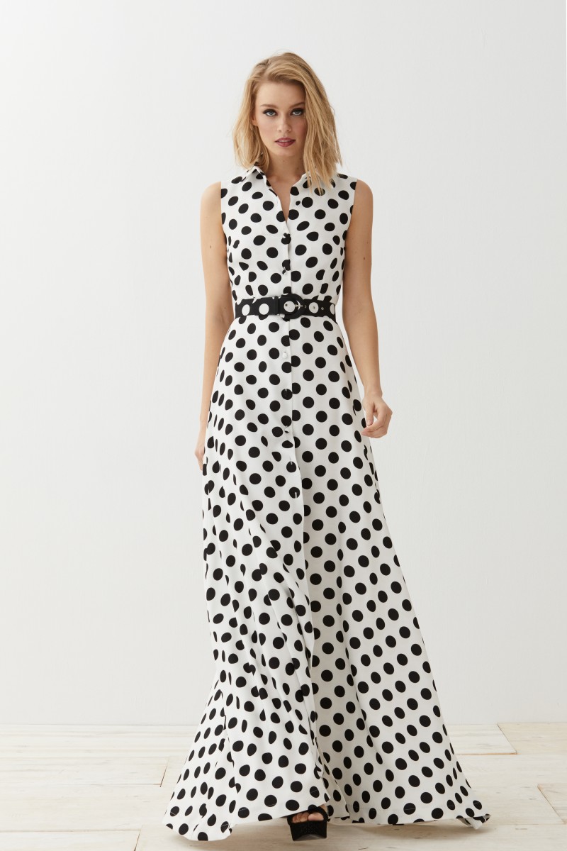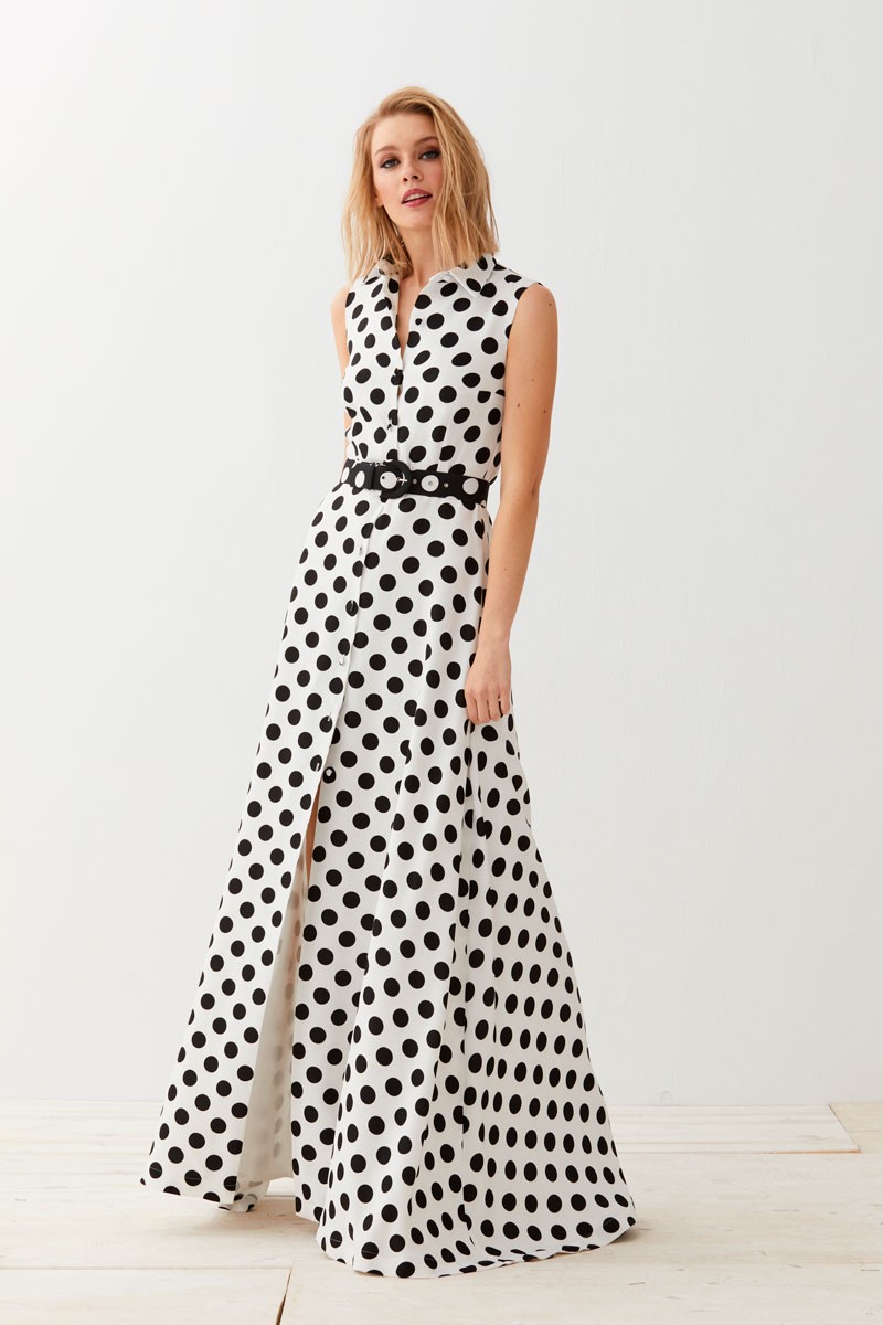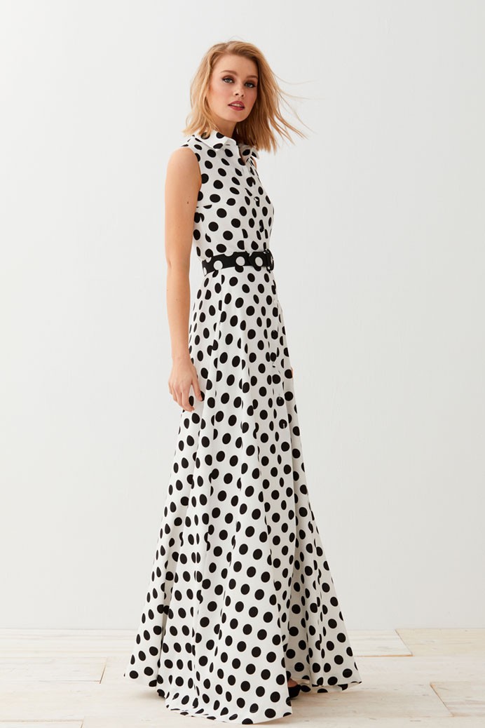 Vestido largo camisero confeccionado en crepe satén blanco con lunares negros de excelente calidad, sin mangas y ajustado en la cintura. Tiene un precioso escote en (...)