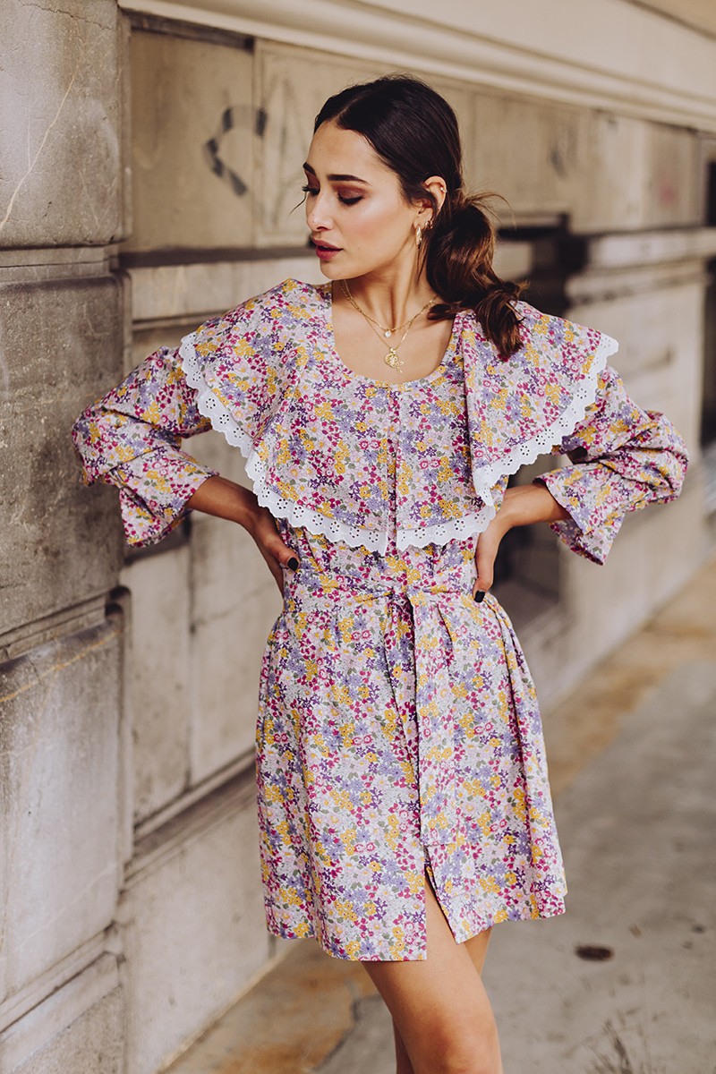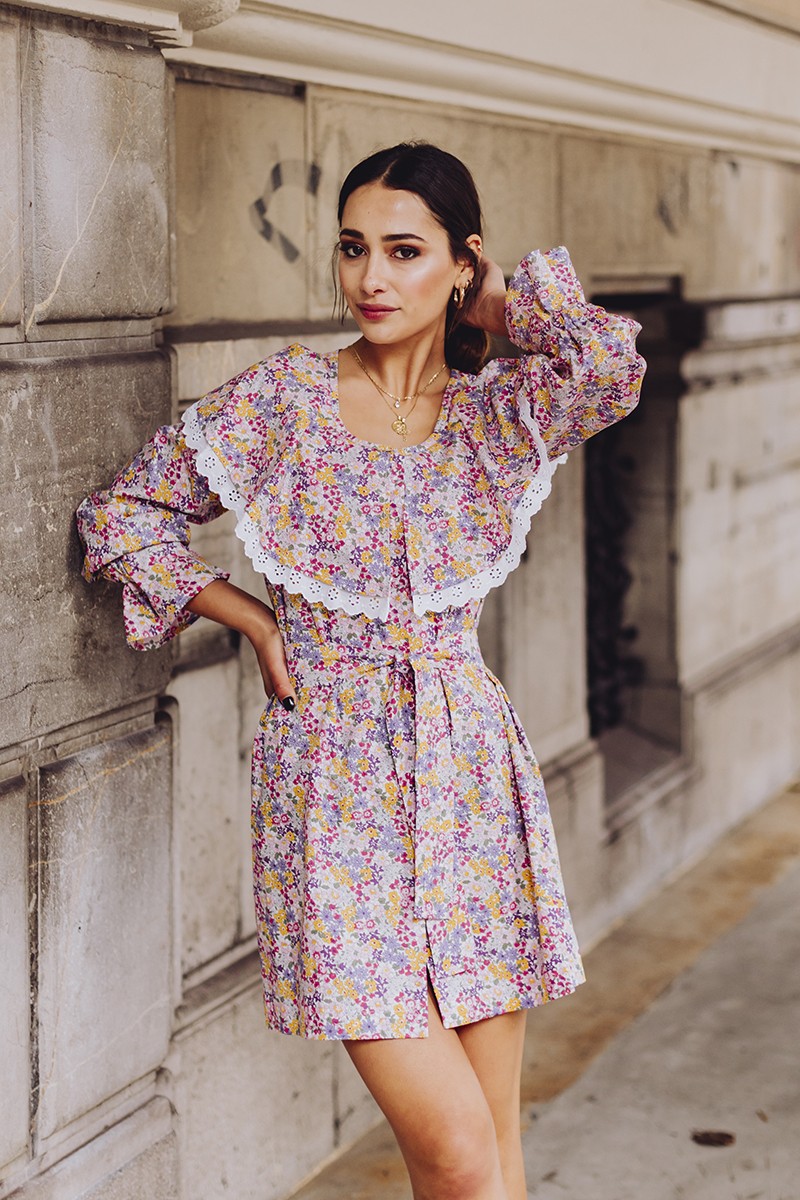 Vestido corto abotonodado con corte de camisa confeccionado en tejido estampado de flores lila, rosa, morado y amarillo. (...)