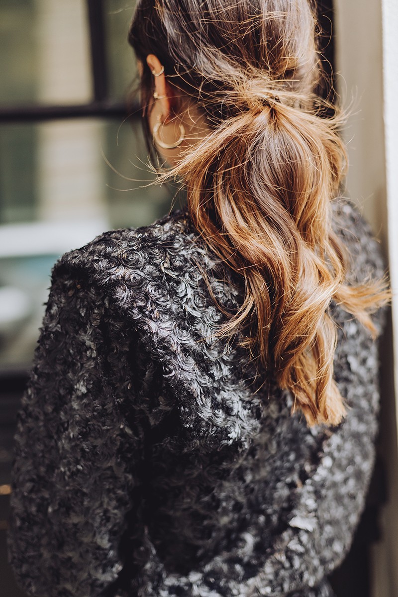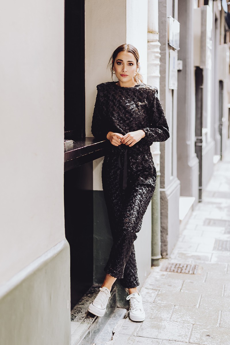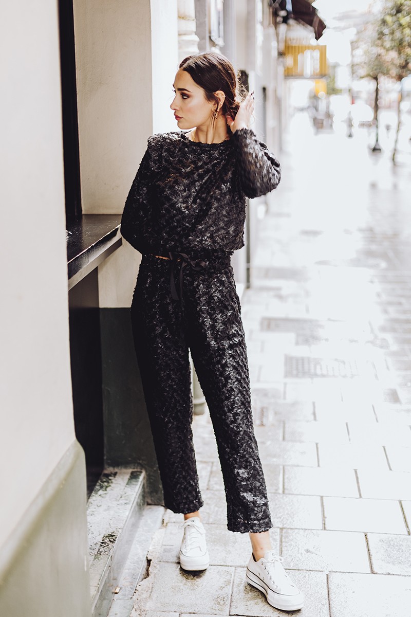 Precioso conjunto de punto confeccionado en un tejido de fantasia pelo negro compuesto por pantalón tobillero con goma en la cintura y jersey a juego con hombros marcados con hombrera y goma en (...)