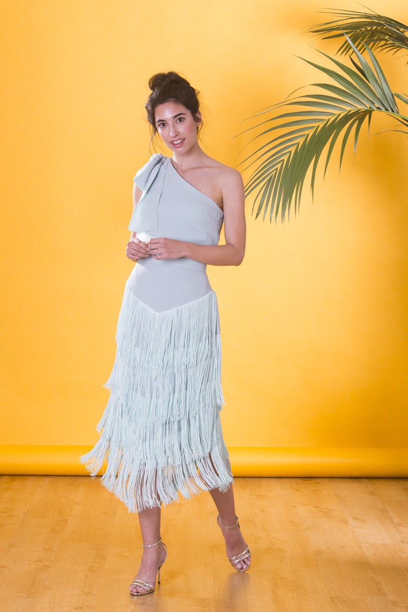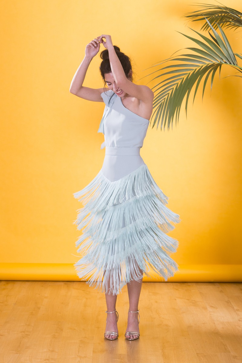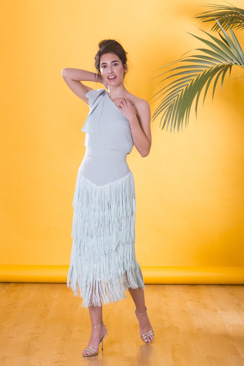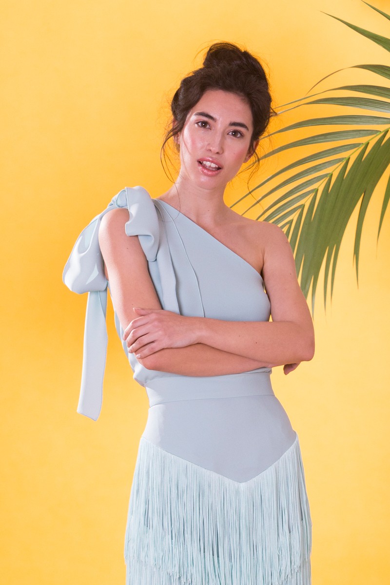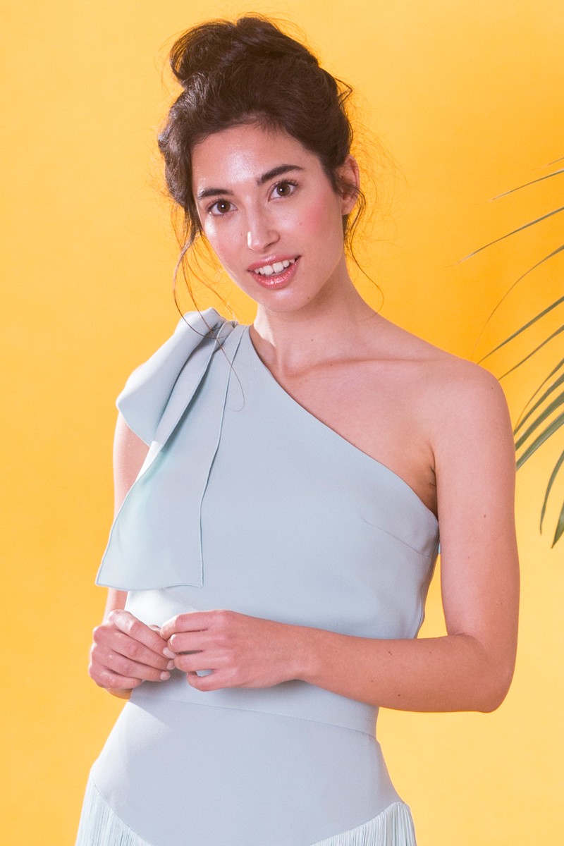 Top asimétrico confeccionado en crepe de color verde agua, de excelente calidad. Diseño asimétrico con lazada en el hombro. (...)