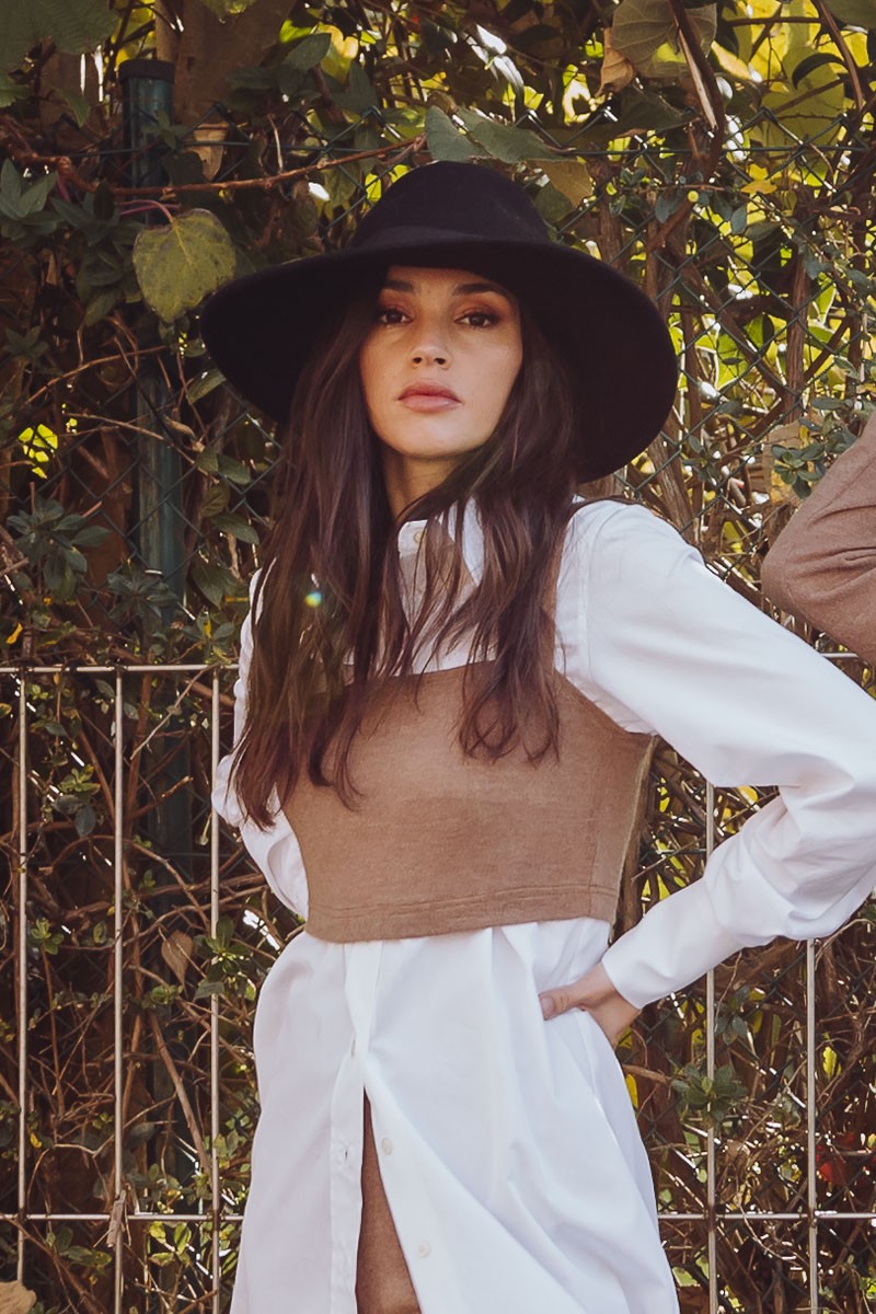 Conjunto de top de tirantes corto confeccionado en punto marrón, largo por debajo del pecho y encima de la cintura para lucir un poco de abdomen;). Escote recto en delantero y (...)